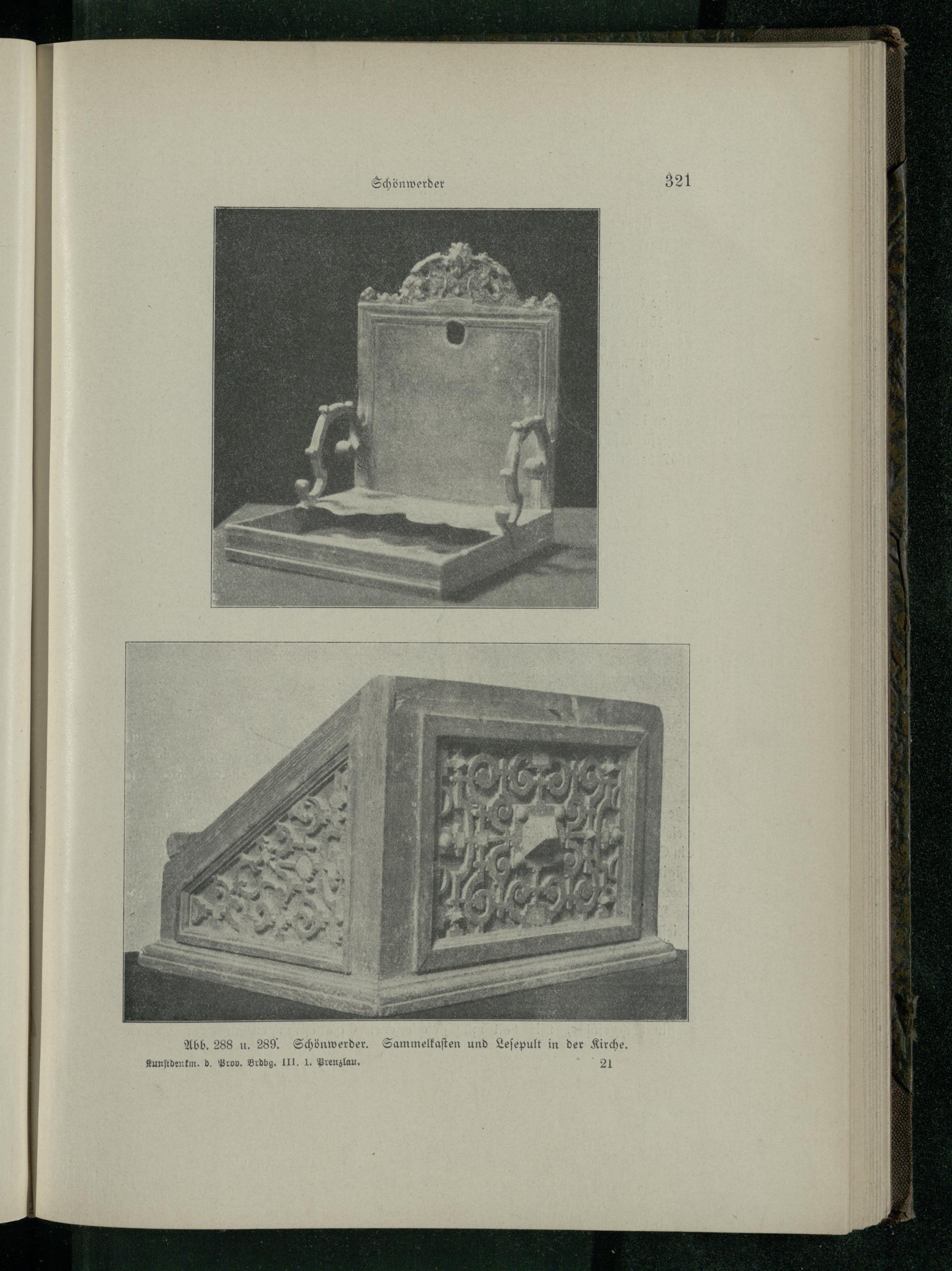 Schönwerder Abb. 288 u. 289. Schönwerder. Sammelkaſten und Leſepult in der Kirche. Kunſtdentm. d. Prov. Brdbg. III. 1. Prenzlau . 21