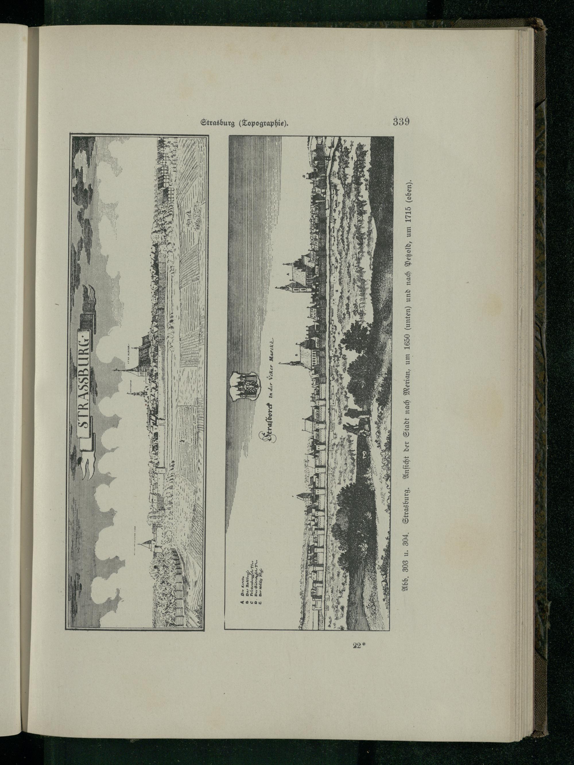 A. Die Kirche B Das Ratthaus C Falckenbergfche Thor D. Das Gutritifche Thor E Der Heldig Fluf 22* STRASSBURG KAISIAIS STAT KIROM Strasbordt In der Vcker Marcké Strasburg( Topographie). 339 Abb. 303 u. 304. Strasburg. Ansicht der Stadt nach Merian, um 1650( unten) und nach Pezold, um 1715( oben).