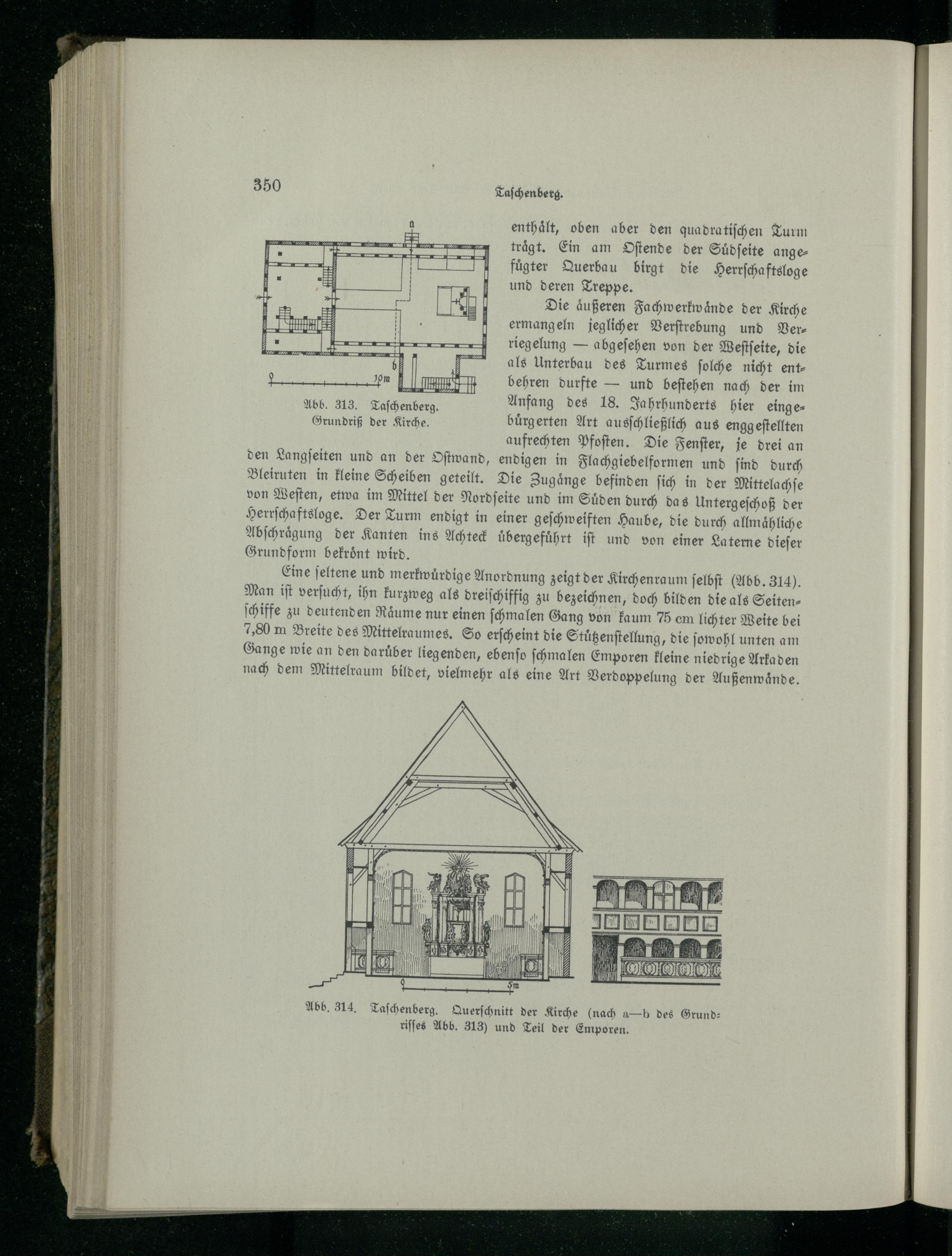 Abb. 313. Taſche Anfang des 18. Jahrhunderts hier eingeGrundriß der Kirche. buͤrgerten Art ausſchließlich aus engg eſtellten aufrechten Pfoſten. Die Fenſter, je drei an den Langſeiten und an der Oſtwand, endigen in Flachgiebelformen und ſind durch Bleiruten in kleine Scheiben geteilt. Die Zugaͤnge befinden ſich in der Mittelachſe von Weſten, etwa im Mittel der Nordſeite und im Suͤden durch das Untergeſchoß der Herrſchaftsloge. Der Turm endigt in einer geſchweiften Haube, die durch allmaͤhliche Abſchraͤgung der Kanten ins Achteck übergeführt iſt und von einer Laterne dieſer Grundform bekroͤnt wird.