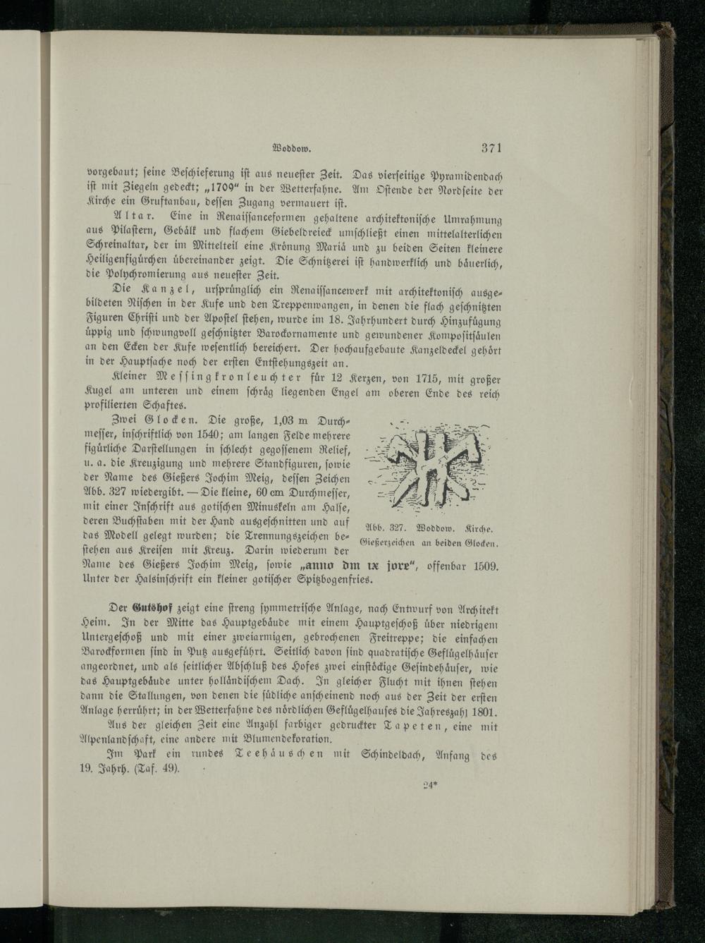 Zwei Glocken. Die große, 1,03 m Durch— meſſer, inſchriftlich von 1540; am langen Felde mehrere figuͤrliche Darſtellungen in ſchlecht gegoſſenem Relief, u. a. die Kreuzigung und mehrere Standfiguren, ſowie der Name des Gießers Jochim Meig, deſſen Zeichen Abb. 327 wiedergibt.— Die kleine, 60 em Durchmeſſer, mit einer Inſchrift aus gotiſchen Minuskeln am Halſe, deren Buchſtaben mit der Hand ausgeſchnitten und auf das Modell gelegt wurden; die Trennungszeichen be— ſtehen aus Kreiſen mit Kreuz. Darin wiederum der Name des Gießers Jochim Meig, ſowie„anno dm 1% jore“, offenbar 1509. Unter der Halsinſchrift ein kleiner gotiſcher Spitzbogenfries.