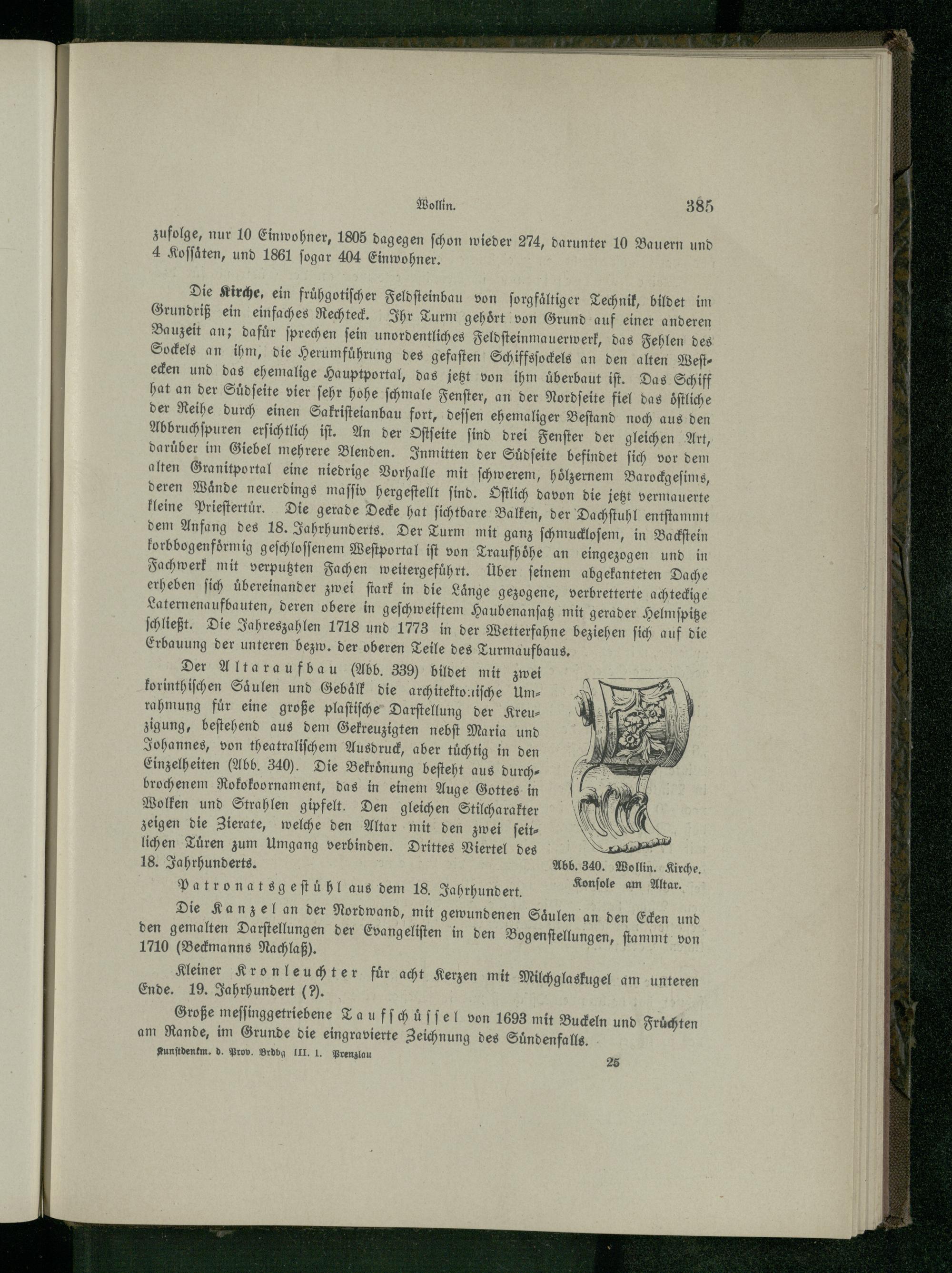 Der Altaraufbau(Abb. 339) bildet mit zwei korinthiſchen Saͤulen und Gebaͤlk die architekto niſche Umrahmung fuͤr eine große plaſtiſche Darſtellung der Kreuzigung, beſtehend aus dem Gekreuzigten nebſt Maria und Johannes, von theatraliſchem Ausdruck, aber tuͤchtig in den Einzelheiten(Abb. 340). Die Bekroͤnung beſteht aus durche brochenem Rokokoornament, das in einem Auge Gottes in Wolken und Strahlen gipfelt. Den gleichen Stilcharakter zeigen die Zierate, welche den Altar mit den zwei ſeitlichen Türen zum Umgang verbinden. Drittes Viertel des 18. Jahrhunderts. Abb. 340. Wollin. Kirche.