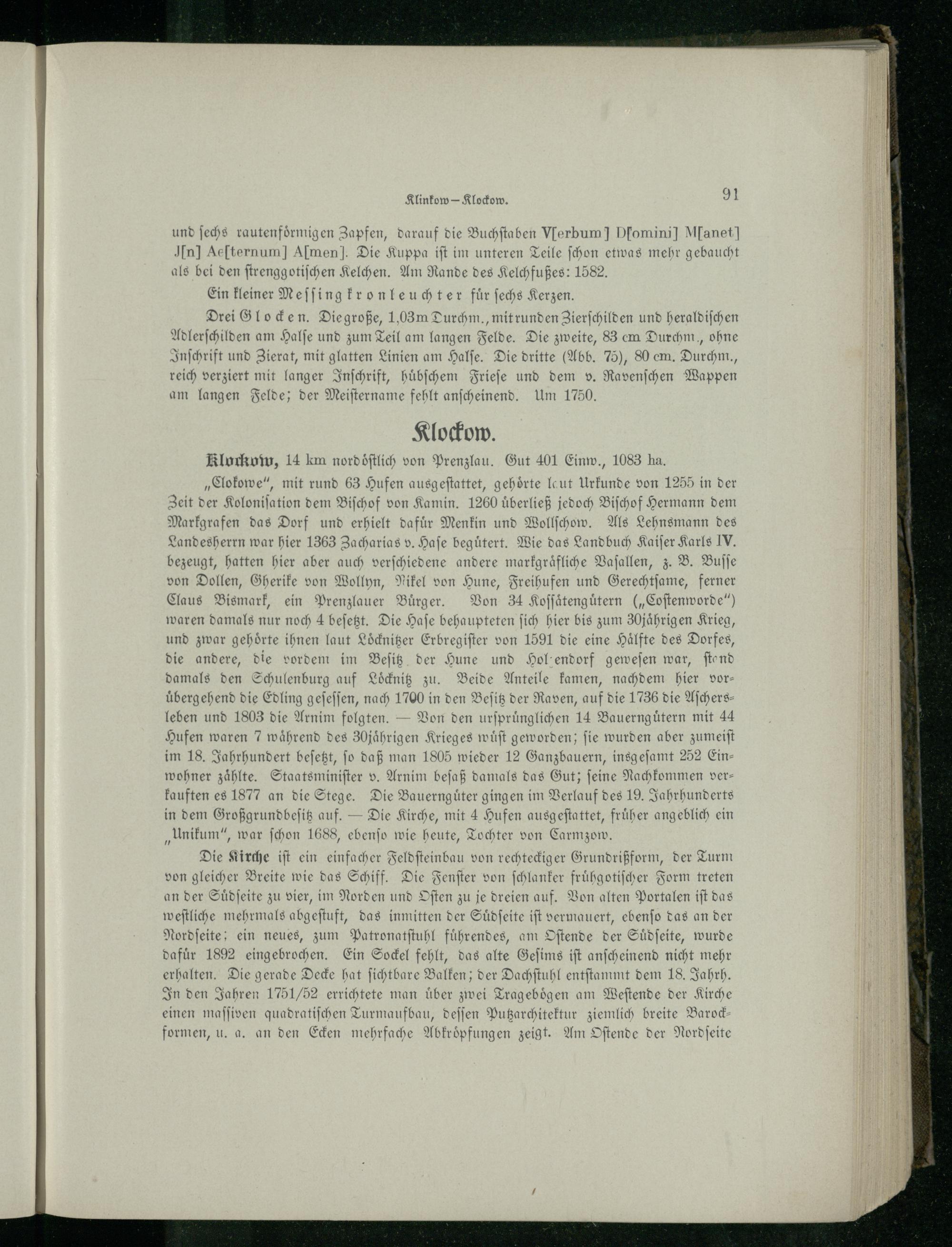 „Clokowe“, mit rund 63 Hufen ausgeſtattet, gehörte laut Urkunde von 1255 in der Zeit der Koloniſation dem Biſchof von Kamin. 1260 überließ jedoch Biſchof Hermann dem Markgrafen das Dorf und erhielt dafuͤr Menkin und Wollſchow. Als Lehnsmann des Landesherrn war hier 1363 Zacharias v. Haſe beguͤtert. Wie das Landbuch Kaiſer Karls IV. bezeugt, hatten hier aber auch verſchiedene andere markgraͤfliche Vaſallen, z. B. Buſſe von Dollen, Gherike von Wollyn, Nikel von Hune, Freihufen und Gerechtſame, ferner Claus Bismark, ein Prenzlauer Bürger. Von 34 Koſſaͤtenguͤtern(„ Coſtenworde“) waren damals nur noch 4 beſetzt. Die Haſe behaupteten ſich hier bis zum 30 jaͤhrigen Krieg, und zwar gehörte ihnen laut Loͤcknitzer Erbregiſter von 1591 die eine Hälfte des Dorfes, die andere, die vordem im Beſitz der Hune und Hol endorf geweſen war, ſtend damals den Schulenburg auf Loͤcknitz zu. Beide Anteile kamen, nachdem hier vor— übergehend die Edling geſeſſen, nach 1700 in den Beſitz der Raven, auf die 1736 die Aſchers— leben und 1803 die Arnim folgten.— Von den urſpruͤnglichen 14 Bauernguͤtern mit 44 Hufen waren waͤhrend des 30jaͤhrigen Krieges wuͤſt geworden; fie wurden aber zumeiſt im 18. Jahrhundert beſetzt, ſo daß man 1805 wieder 12 Ganzbauern, insgeſamt 252 Ein— wohner zählte. Staatsminiſter v. Arnim beſaß damals das Gut; feine Nachkommen verkauften es 1877 an die Stege. Die Bauernguͤter gingen im Verlauf des 19. Jahrhunderts in dem Großgrundbeſitz auf.— Die Kirche, mit 4 Hufen ausgeſtattet, fruͤher angeblich ein war ſchon 1688, ebenſo wie heute, Tochter von Carmzow.