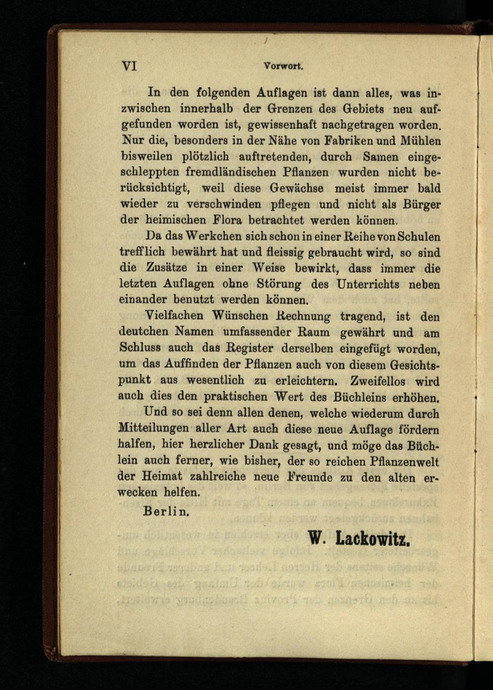Und so sei denn allen denen, welche wiederum durch Mitteilungen aller Art auch diese neue Auflage fördern halfen, hier herzlicher Dank gesagt, und möge das Büchlein auch ferner, wie bisher, der so reichen Pflanzenwelt der Heimat zahlreiche neue Freunde zu den alten erwecken helfen.