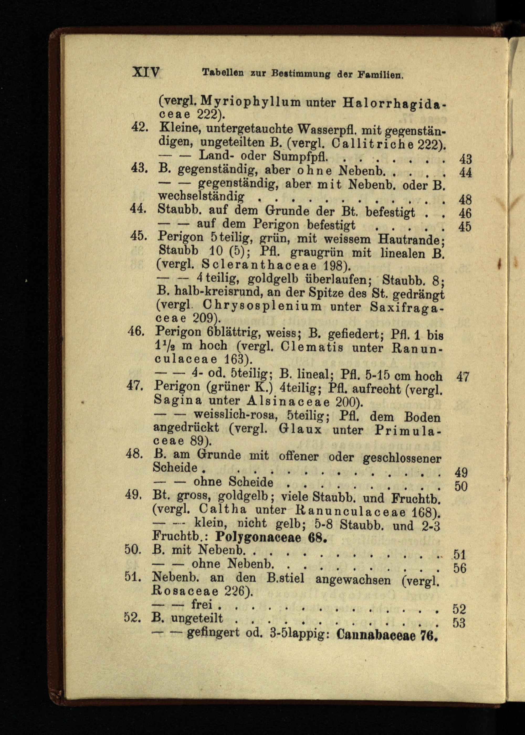 42. Kleine, untergetauchte Wasserpfl. mit gegenständigen, ungeteilten B. (vergl. Callitriehe 222).