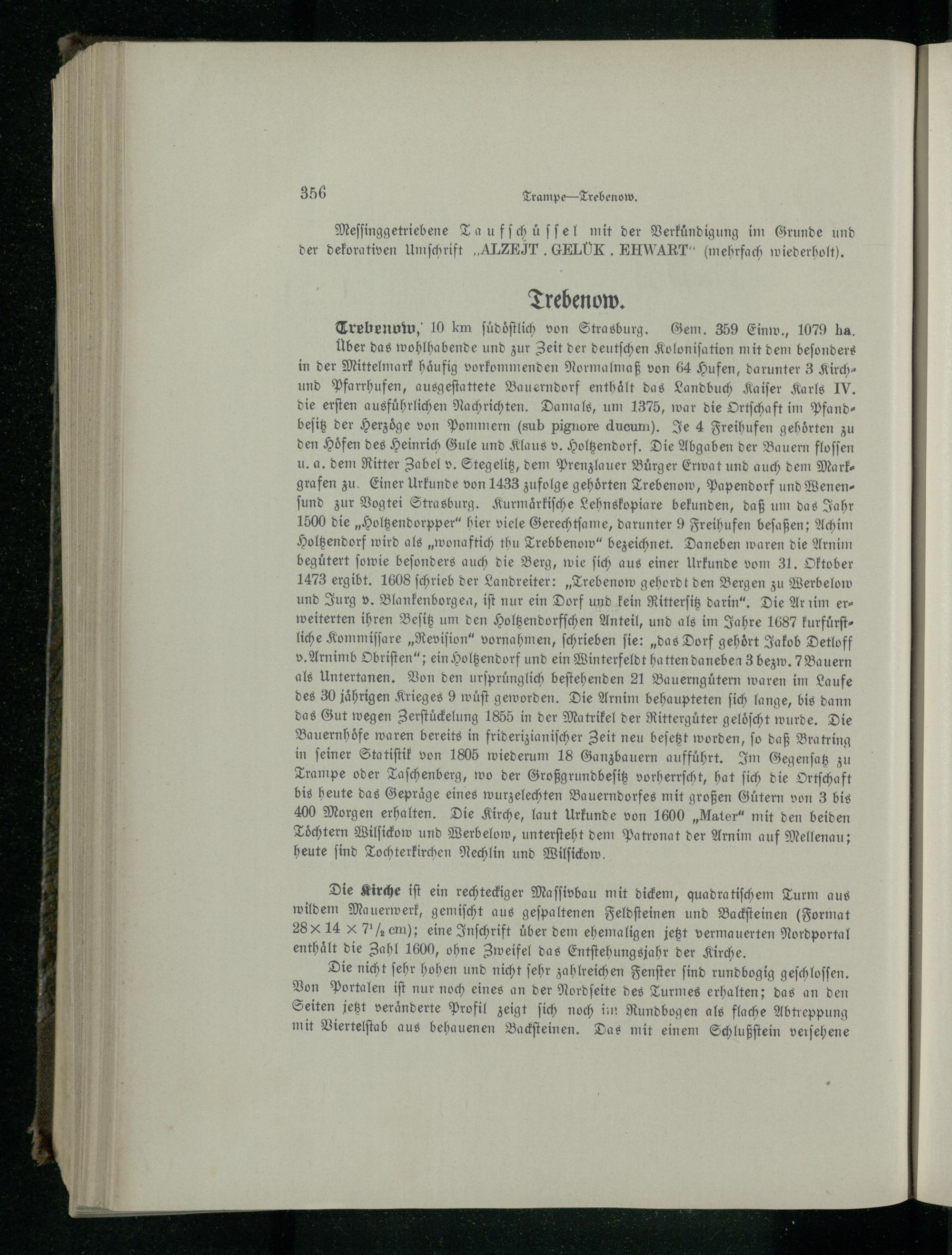Über das wohlhabende und zur Zeit der deutſchen Koloniſation mit dem beſonders in der Mittelmark haͤufig vorkommenden Normalmaß von 64 Hufen, darunter 3 Kirch— und Pfarrhufen, ausgeſtattete Bauerndorf enthält das Landbuch Kaiſer Karls IV. die erſten ausführlichen Nachrichten. Damals, um 1375, war die Ortſchaft im Pfand— beſitz der Herzöge von Pommern (sub pignore ducum). Je 4 Freihufen gehörten zu den Höfen des Heinrich Gule und Klaus v. Holtzendorf. Die Abgaben der Bauern floſſen u. a. dem Ritter Zabel v. Stegelitz, dem Prenzlauer Buͤrger Erwat und auch dem Mark— grafen zu. Einer Urkunde von 1433 zufolge gehörten Trebenow, Papendorf und Wenenſund zur Vogtei Strasburg. Kurmaͤrkiſche Lehnskopiare bekunden, daß um das Jahr 1500 die„Holtzendorpper“ hier viele Gerechtſame, darunter 9 Freihufen beſaßen; Achim Holtzendorf wird als„wonaftich thu Trebbenow“ bezeichnet. Daneben waren die Arnim beguͤtert ſowie beſonders auch die Berg, wie ſich aus einer Urkunde vom 31. Oktober 1473 ergibt. 1608 ſchrieb der Landreiter:„Trebenow gehordt den Bergen zu Werbelow und Jurg v. Blankenborgen, iſt nur ein Dorf und kein Ritterſitz darin“. Die Ar nim er— weiterten ihren Beſitz um den Holtzendorfſchen Anteil, und als im Jahre 1687 kurfuͤrſtliche Kommiſſare„Reviſion“ vornahmen, ſchrieben fie:„das Dorf gehört Jakob Detloff v. Arnimb Obriſten“; ein Holtzendorf und ein Winterfeldt hatten daneben 3 bezw. 7 Bauern als Untertanen. Von den urſpruͤnglich beſtehenden 21 Bauernguͤtern waren im Laufe des 30 jährigen Krieges 9 wuͤſt geworden. Die Arnim behaupteten ſich lange, bis dann das Gut wegen Zerſtuͤckelung 1855 in der Matrikel der Ritterguͤter geloͤſcht wurde. Die Bauernhoͤfe waren bereits in friderizianiſcher Zeit neu beſetzt worden, ſo daß Bratring in feiner Statiſtik von 1805 wiederum 18 Ganzbauern auffuͤhrt. Im Gegenſatz zu Trampe oder Taſchenberg, wo der Großgrundbeſitz vorherrſcht, hat ſich die Ortſchaft bis heute das Gepraͤge eines wurzelechten Bauerndorfes mit großen Guͤtern von 3 bis 400 Morgen erhalten. Die Kirche, laut Urkunde von 1600„Mater“ mit den beiden Toͤchtern Wilſickow und Werbelow, unterſteht dem Patronat der Arnim auf Mellenau; heute ſind Tochterkirchen Nechlin und Wilſickow.