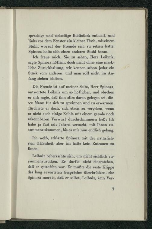 sprachige und vielseitige Bibliothek enthielt, und links vor dem Fenster ein kleiner Tisch, mit einem Stuhl, worauf der Fremde sich zu setzen hatte. Spinoza holte sich einen anderen Stuhl heran.