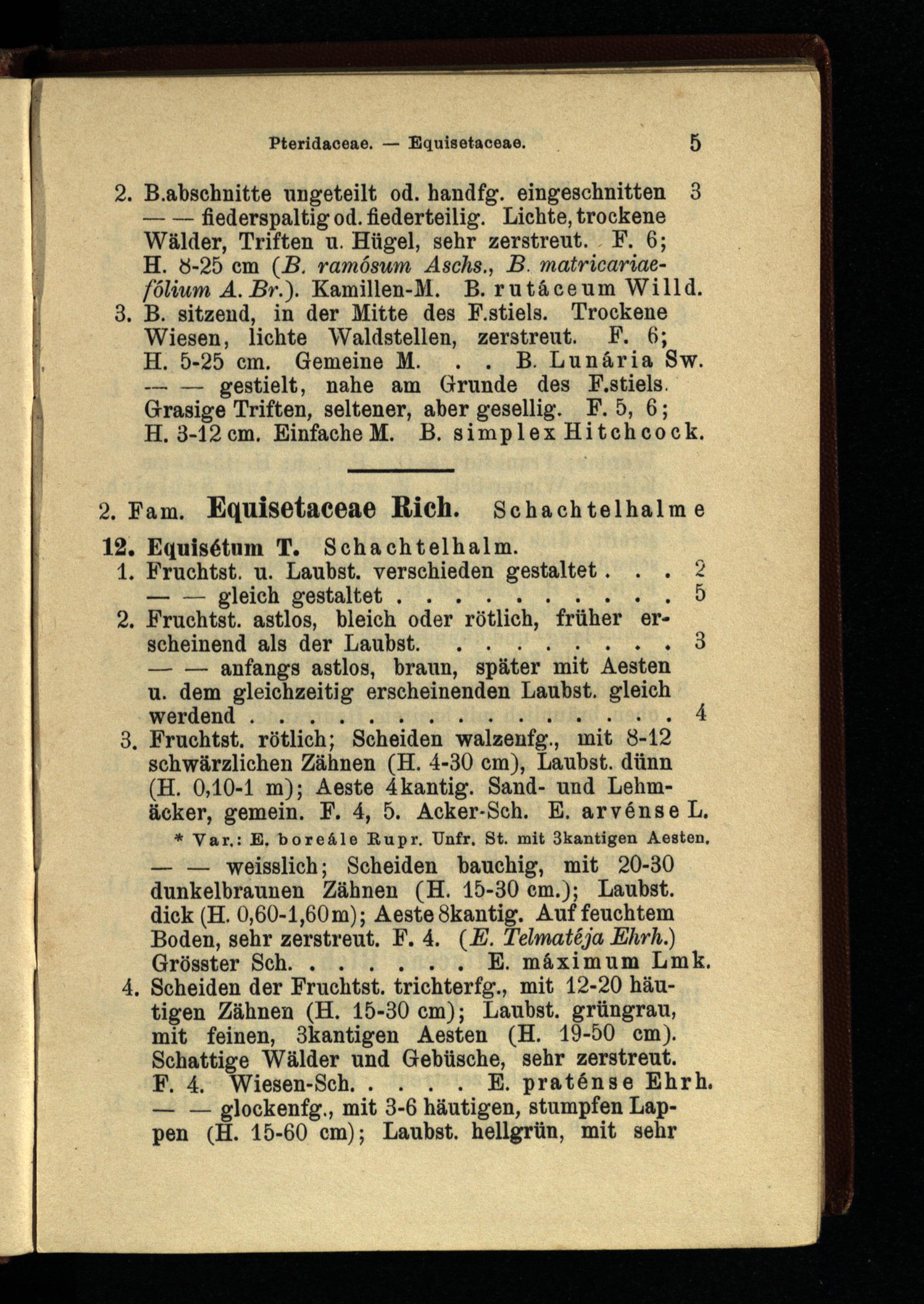 dunkelbraunen Zähnen (H. 15-30 cm.); Laubst. dick (H. 0,60-1,60m); Aeste 8kantig. Auf feuchtem Boden, sehr zerstreut. F. 4. (E. Telmateja Ehrh.) Grösster Sch.E. mäximum Lmk.