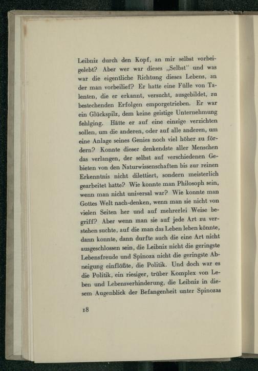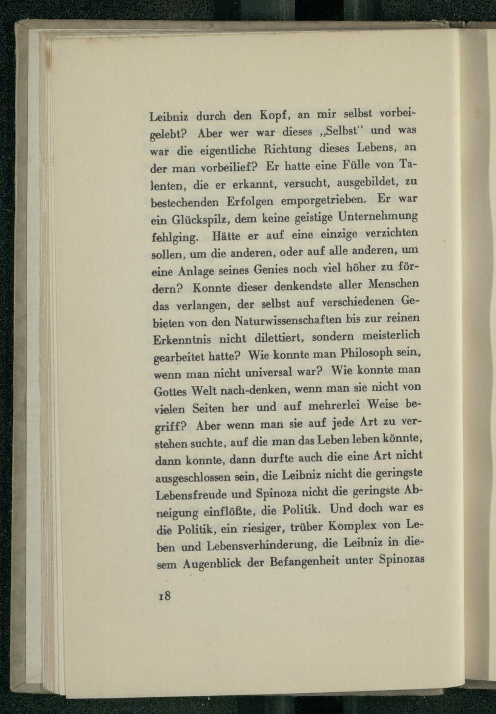 Leibniz durch den Kopf, an mir selbst vorbeigelebt? Aber wer war dieses„Selbst‘‘ und was war die eigentliche Richtung dieses Lebens, an der man vorbeilief? Er hatte eine Fülle von Talenten, die er erkannt, versucht, ausgebildet, zu bestechenden Erfolgen emporgetrieben. Er war ein Glückspilz, dem keine geistige Unternehmung fehlging. Hätte er auf eine einzige- verzichten sollen, um die anderen, oder auf alle anderen, um eine Anlage seines Genies noch viel höher zu fördern? Konnte dieser denkendste aller Menschen das verlangen, der selbst auf verschiedenen Gebieten von den Naturwissenschaften bis zur reinen Erkenntnis nicht dilettiert, sondern meisterlich gearbeitet hatte? Wie konnte man Philosoph sein, wenn man nicht universal war? Wie konnte man Gottes Welt nach-denken, wenn man sie nicht von vielen Seiten her und auf mehrerlei Weise begriff? Aber wenn man sie auf jede Art zu verstehen suchte, auf die man das Leben leben könnte, dann konnte, dann durfte auch die eine Art nicht ausgeschlossen sein, die Leibniz nicht die geringste Lebensfreude und Spinoza nicht die geringste Abneigung einflößte, die Politik. Und doch war es die Politik, ein riesiger, trüber Komplex von Leben und Lebensverhinderung, die Leibniz in diesem Augenblick der Befangenheit unter Spinozas