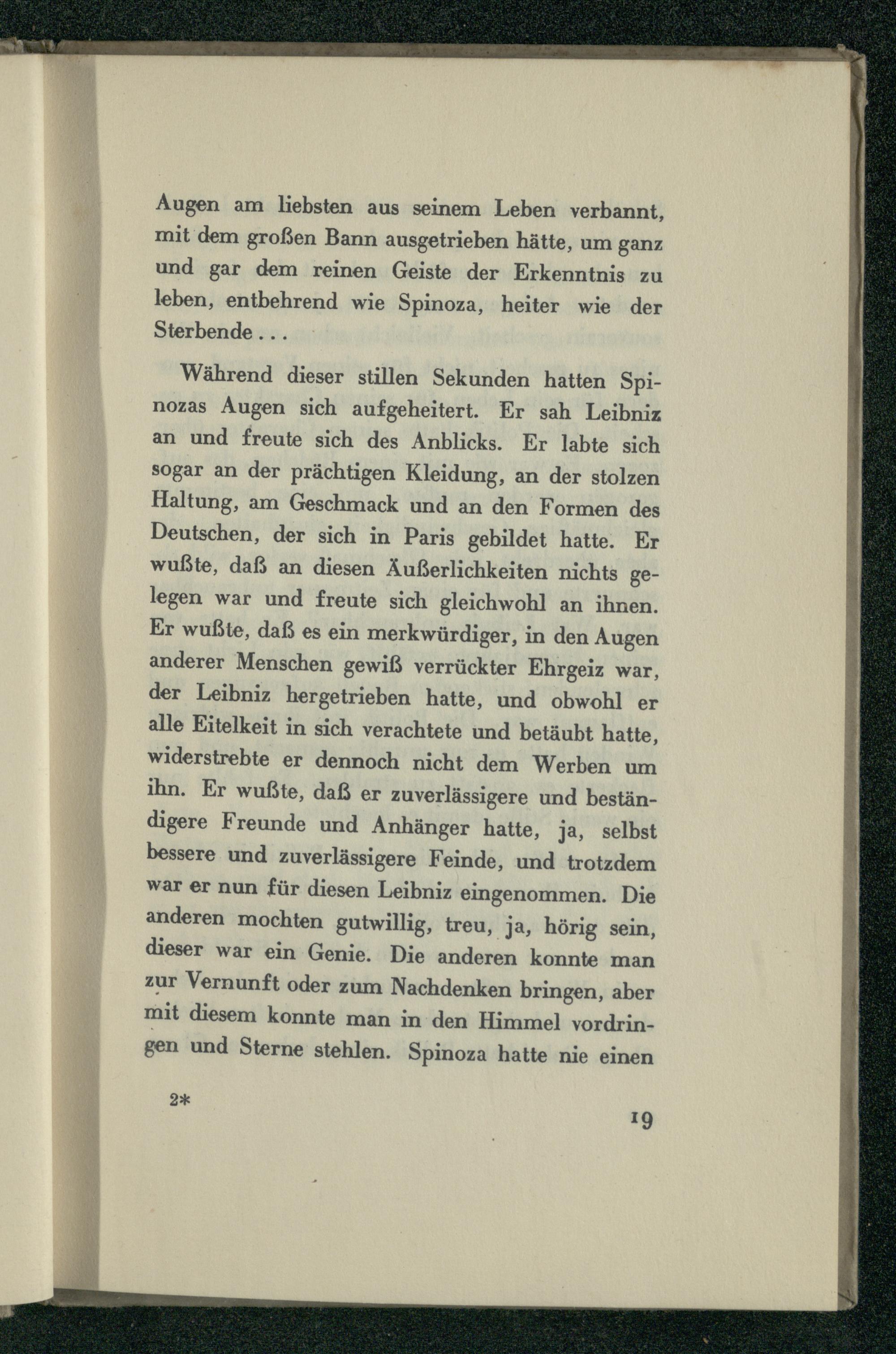 Während dieser stillen Sekunden hatten Spinozas Augen sich aufgeheitert. Er sah Leibniz an und freute sich des Anblicks. Er labte sich sogar an der prächtigen Kleidung, an der stolzen Haltung, am Geschmack und an den Formen des Deutschen, der sich in Paris gebildet hatte. Er wußte, daß an diesen Äußerlichkeiten nichts gelegen war und freute sich gleichwohl an ihnen. Er wußte, daß es ein merkwürdiger, in den Augen anderer Menschen gewiß verrückter Ehrgeiz war, der Leibniz hergetrieben hatte, und obwohl er alle Eitelkeit in sich verachtete und betäubt hatte, widerstrebte er dennoch nicht dem Werben um ihn. Er wußte, daß er zuverlässigere und beständigere Freunde und Anhänger hatte, ja, selbst bessere und zuverlässigere Feinde, und trotzdem war er nun für diesen Leibniz eingenommen. Die anderen mochten gutwillig, treu, ja, hörig sein, dieser war ein Genie. Die anderen konnte man zur Vernunft oder zum Nachdenken bringen, aber mit diesem konnte man in-den Himmel vordringen und Sterne stehlen. Spinoza hatte nie einen