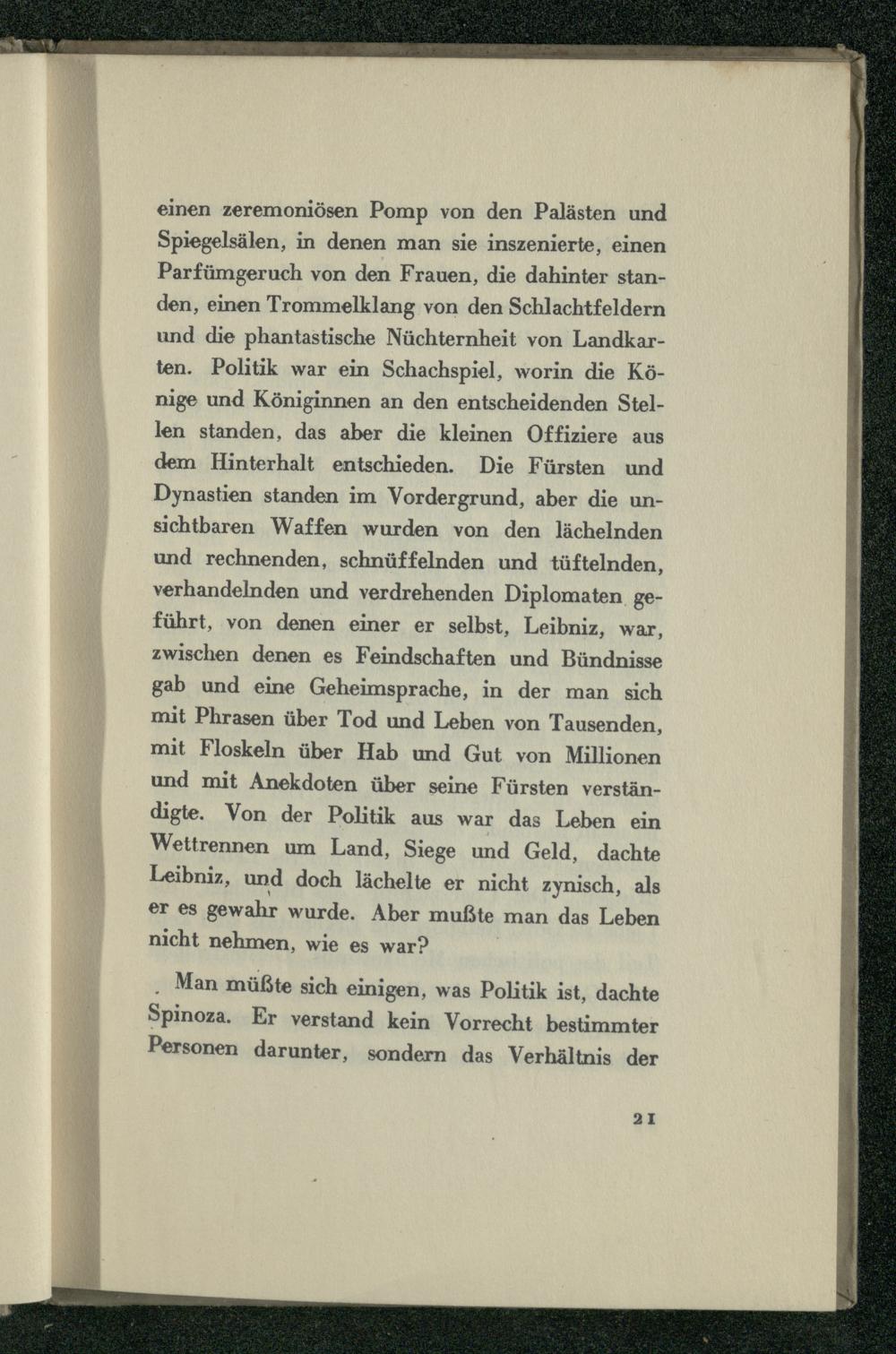 einen zeremoniösen Pomp von den Palästen und Spiegelsälen, in denen man sie inszenierte, einen Parfümgeruch von den Frauen, die dahinter standen, einen Trommelklang von den Schlachtfeldern und die phantastische Nüchternheit von Landkarten. Politik war ein Schachspiel, worin die Könige und Königinnen an den entscheidenden Stellen standen, das aber die kleinen Offiziere aus dem Hinterhalt entschieden. Die Fürsten und Dynastien standen im Vordergrund, aber die unsichtbaren Waffen wurden von den lächelnden und rechnenden, schnüffelnden und tüftelnden, verhandelnden und verdrehenden Diplomaten. geführt, von denen einer er selbst, Leibniz, war, zwischen denen es Feindschaften und Bündnisse gab und eine Geheimsprache, in der man sich mit Phrasen über Tod und Leben von Tausenden, mit Floskeln über Hab und Gut von Millionen und mit Anekdoten über seine Fürsten verständigte. Von der Politik aus war das Leben ein Wettrennen um Land, Siege und Geld, dachte Leibniz, und doch lächelte er nicht zynisch, als er es gewahr wurde. Aber mußte man das Leben nicht nehmen, wie es war?