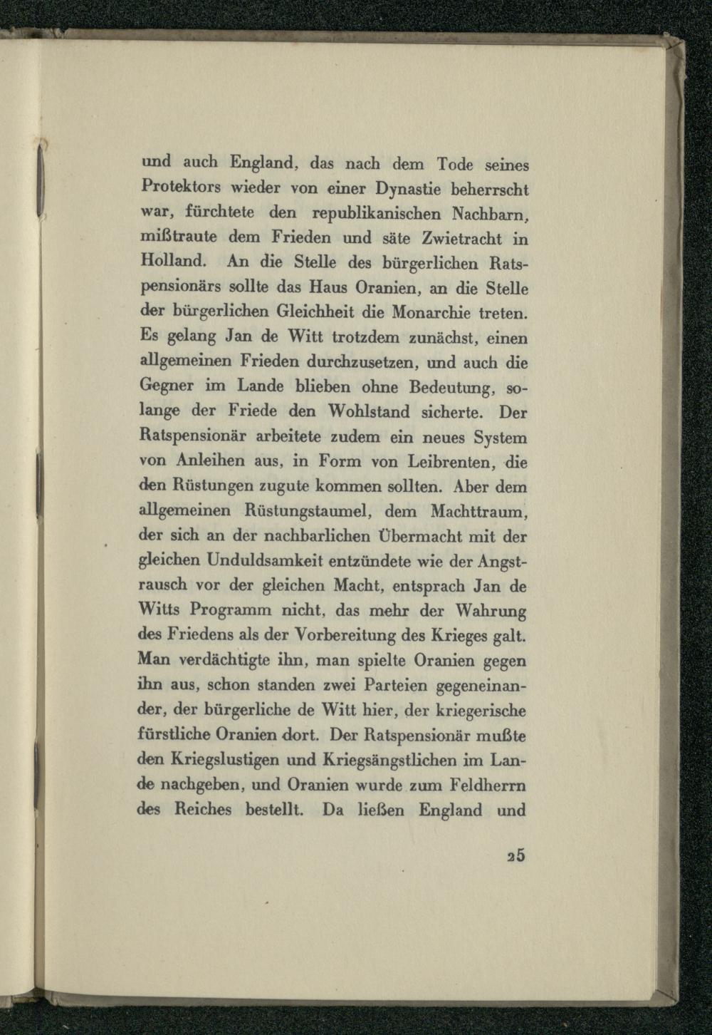 und auch England, das nach dem Tode seines Protektors wieder von einer Dynastie beherrscht war, fürchtete den republikanischen Nachbarn, mißtraute dem Frieden und säte Zwietracht in Holland . An die Stelle des bürgerlichen Ratspensionärs sollte das Haus Oranien , an die Stelle der bürgerlichen Gleichheit die Monarchie treten. Es gelang Jan de Witt trotzdem zunächst, einen allgemeinen Frieden durchzusetzen, und auch die Gegner im Lande blieben ohne Bedeutung, solange der Friede den Wohlstand sicherte. Der Ratspensionär arbeitete zudem ein neues System von Anleihen aus, in Form von Leibrenten, die den Rüstungen zugute kommen sollten. Aber dem allgemeinen Rüstungstaumel, dem Machttraum, der sich an der nachbarlichen Übermacht mit der gleichen Unduldsamkeit entzündete wie der Angstrausch vor der gleichen Macht, entsprach Jan de Witts Programm nicht, das mehr der Wahrung des Friedens als der Vorbereitung des Krieges galt. Man verdächtigte ihn, man spielte Oranien gegen ihn aus, schon standen zwei Parteien gegeneinander, der bürgerliche de Witt hier, der kriegerische fürstliche Oranien dort. Der Ratspensionär mußte den Kriegslustigen und Kriegsängstlichen im Lande nachgeben, und Oranien wurde zum Feldherrn des Reiches bestellt. Da ließen England und
