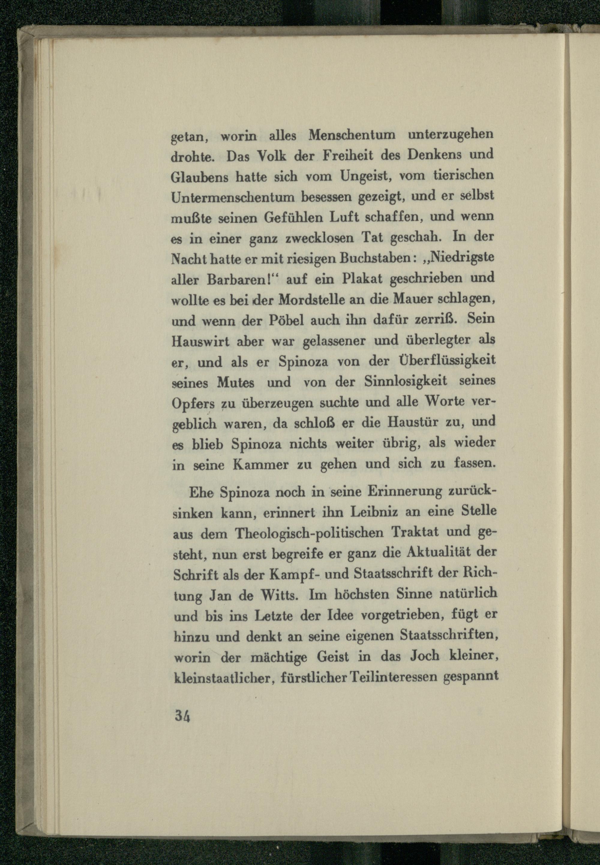 getan, worin alles Menschentum unterzugehen drohte. Das Volk der Freiheit des Denkens und Glaubens hatte sich vom Ungeist, vom tierischen Untermenschentum besessen gezeigt, und er selbst mußte seinen Gefühlen Luft schaffen, und wenn es in einer ganz zwecklosen Tat geschah. In der Nacht hatte er mit riesigen Buchstaben:„Niedrigste aller Barbaren!‘ auf ein Plakat geschrieben und wollte es bei der Mordstelle an die Mauer schlagen, und wenn der Pöbel auch ihn dafür zerriß. Sein Hauswirt aber war gelassener und überlegter als er, und als er Spinoza von der Überflüssigkeit seines Mutes und von der Sinnlosigkeit seines Opfers zu überzeugen suchte und alle Worte vergeblich waren, da schloß er die Haustür zu, und es blieb Spinoza nichts weiter übrig, als wieder in seine Kammer zu gehen und sich zu fassen.
