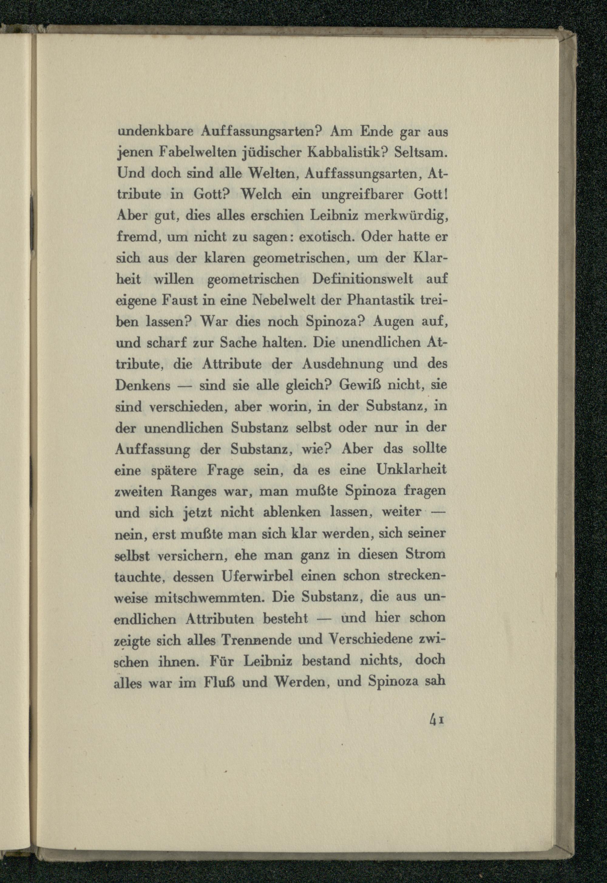 undenkbare Auffassungsarten?” Am Ende gar aus jenen Fabelwelten jüdischer Kabbalistik? Seltsam. Und doch sind alle Welten, Auffassungsarten, Attribute in Gott? Welch ein ungreifbarer Gott! Aber gut, dies alles erschien Leibniz merkwürdig, fremd, um nicht zu sagen: exotisch. Oder hatte er sich aus der klaren geometrischen, um der Klarheit willen geometrischen Definitionswelt auf eigene Faust in eine Nebelwelt der Phantastik treiben lassen? War dies noch Spinoza?” Augen auf, und scharf zur Sache halten. Die unendlichen Attribute, die Attribute der Ausdehnung und des Denkens— sind sie alle gleich? Gewiß nicht, sie sind verschieden, aber worin, in der Substanz, in der unendlichen Substanz selbst oder nur in der Auffassung der Substanz, wie? Aber das sollte eine spätere Frage sein, da es eine Unklarheit zweiten Ranges war, man mußte Spinoza fragen und sich jetzt nicht ablenken lassen, weiter:— nein, erst mußte man sich klar werden, sich seiner selbst versichern, ehe man ganz in diesen Strom tauchte, dessen Uferwirbel einen schon streckenweise mitschwemmten. Die Substanz, die aus unendlichen Attributen besteht— und hier schon zeigte sich alles Trennende und Verschiedene zwischen ihnen. Für Leibniz bestand nichts, doch alles war im Fluß und Werden, und Spinoza sah