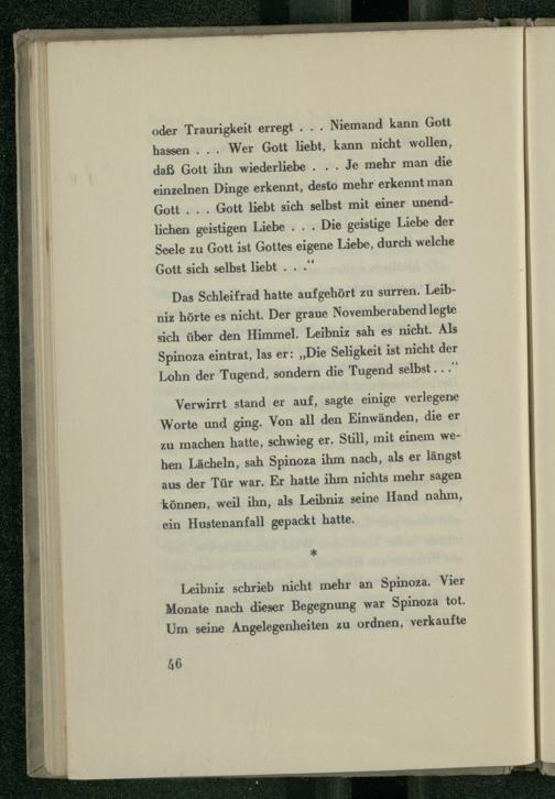 Verwirrt stand er auf, sagte einige verlegene Worte und ging. Von all den Einwänden, die er zu machen hatte, schwieg er. Still, mit einem wehen Lächeln, sah Spinoza ihm nach, als er längst aus der Tür war. Er hatte ihm nichts mehr sagen können, weil ihn, als Leibniz seine Hand nahm, ein Hustenanfall gepackt hatte.