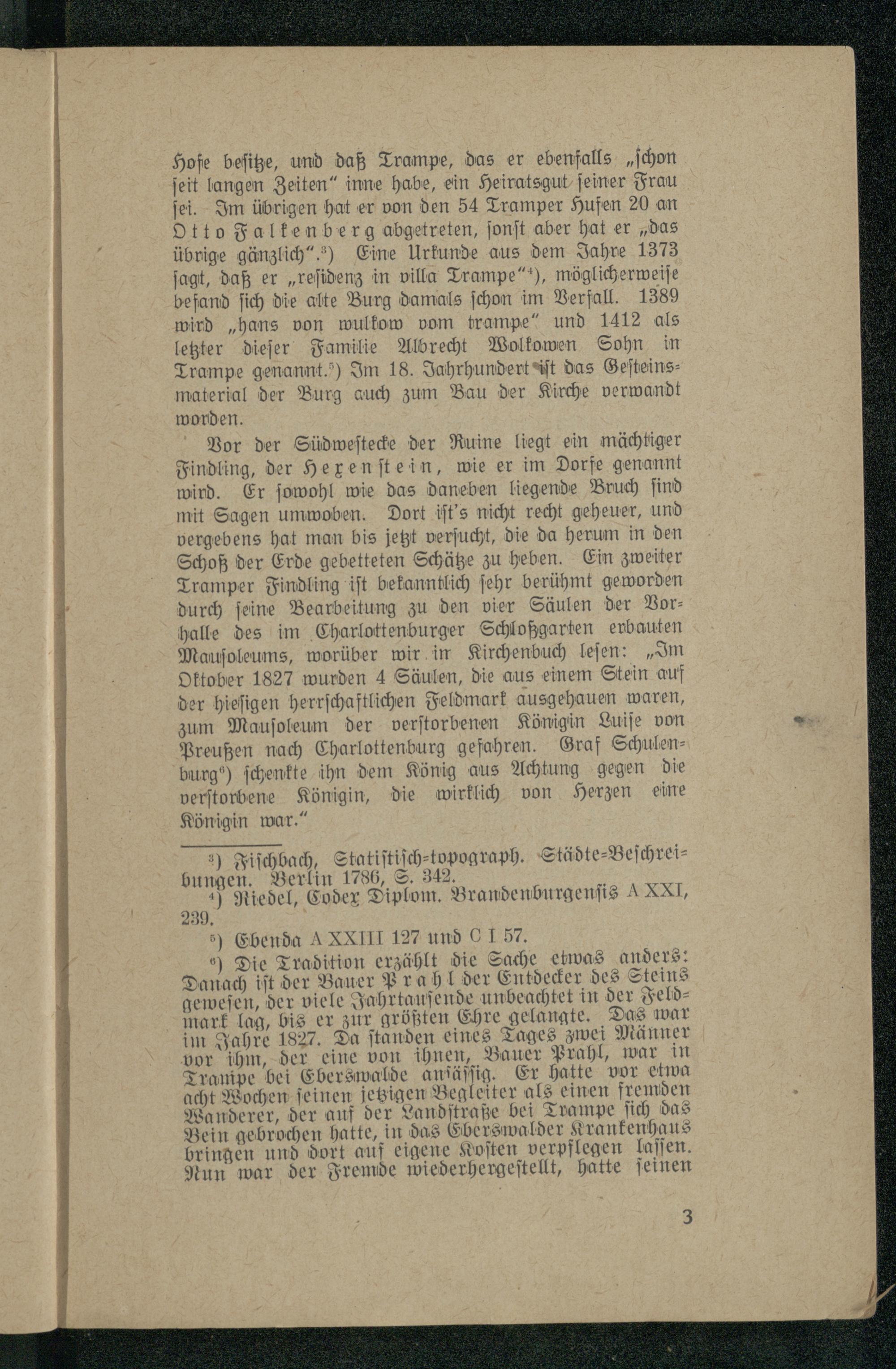 Die Tradition erzählt die Sache etwas anders: Danach iſt der Bauer Pr ahlder Entdecker des Steins geweſen, der viele Jahrtauſende unbeachtet in der Feldmark lag, bis er zur größten Ehre gelangte. Das war im Jahre 1827. Da ſtanden eines Tages zwei Männer vor ihm, der eine von ihnen, Bauer Prahl, war in Tranpe bei Eberswalde anſäſſig, Er hatte vor etwa