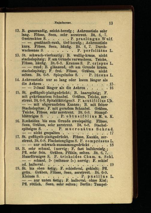 13. St. schwach-vierkantig; B. wellig-kraus, nicht stachelspitzig; F. am Grunde verwachsen. Teiche, Flüsse, häufig. Bt. 6-8. KrausesS. P. crispus L.