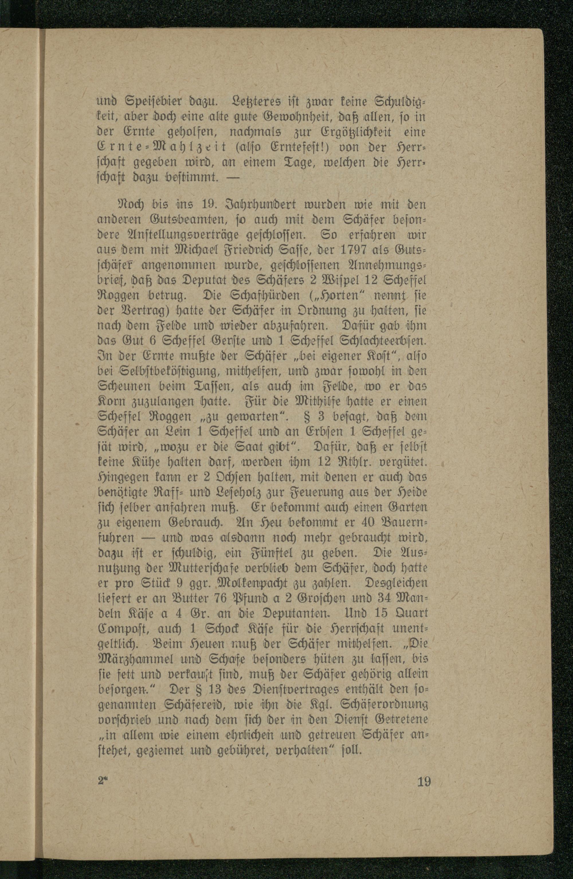 Noch bis ins 19. Jahrhundert wurden wie mit den anderen Gutsbeamten, ſo auch mit dem Schäfer beſondere Anſtellungsverträge geſchloſſen. So erfahren wir aus dem mit Michael Friedrich Saſſe, der 1797 als Gutsſchäfer angenommen wurde, geſchloſſenen Annehmungs—brief, daß das Deputat des Schäfers 2 Wiſpel 12 Scheffel Roggen betrug. Die Schafhürden(„Horten“ nennt ſie der Vertrag) hatte der Schäfer in Ordnung zu halten, ſie nach dem Felde und wieder abzufahren. Dafür gab ihm das Gut 6 Scheffel Gerſte und 1 Scheffel Schlachteerbſen. In der Ernte mußte der Schäfer„bei eigener Koſt“, alſo bei Selbſtbeköſtigung, mithelfen, und zwar ſowohl in den Scheunen beim Taſſen, als auch im Felde, wo er das Korn zuzulangen hatte. Für die Mithilfe hatte er einen Scheffel Roggen„zu gewarten“. 8 3 beſagt, daß dem Schäfer an Lein 1 Scheffel und an Erbſen 1 Scheffel geſät wird,„wozu er die Saat gibt“. Dafür, daß er ſelbſt keine Kühe halten darf, werden ihm 12 Rthlr. vergütet. Hingegen kann er 2 Ochſen halten, mit denen er auch das benötigte Raff⸗ und Leſeholz zur Feuerung aus der Heide ſich ſelber anfahren muß. Er bekommt auch einen Garten zu eigenem Gebrauch. An Heu bekommt er 40 Bauernfuhren— und was alsdann noch mehr gebraucht wird, dazu iſt er ſchuldig, ein Fünftel zu geben. Die Ausnutzung der Mutterſchafe verblieb dem Schäfer, doch hatte er pro Stück 9 ggr. Molkenpacht zu zahlen. Desgleichen liefert er an Butter 76 Pfund a 2 Groſchen und 34 Mandeln Käſe a 4 Gr. an die Deputanten. Und 15 Quart Compoſt, auch 1 Schock Käſe für die Herrſchaft unentgeltlich. Beim Heuen muß der Schäfer mithelfen.„Die Märzhammel und Schafe beſonders hüten zu laſſen, bis fie fett und verkauft ſind, muß der Schäfer gehörig allein beſorgen.“ Der§ 13 des Dienſtvertrages enthält den ſogenannten Schäfereid, wie ihn die Kgl. Schäferordnung vorſchrieb und nach dem ſich der in den Dienſt Getretene „in allem wie einem ehrlichen und getreuen Schäfer anſtehet, geziemet und gebühret, verhalten“ ſoll.