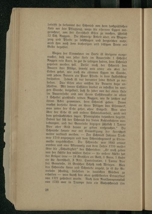 Wegen der Einwohner im Dorfe iſt übrigens ausge: machet, daß von jeder Hufe im Bauerfelde 1 Scheffel Roggen rein Korn, ſo gut ſie ſelbigen haben, dem Schmied gegeben werden ſoll. Dafür muß der Schmied den Bauern ihre Pflüge, ſowohl was unter als ober der Erden gehet, wie auch die eiſernen Eggen im Stande, und jedem Bauern ein Paar Pferde in dem Hufbeſchlag freihalten. Jedoch iſt nur darunter ſeine Arbeit zu verſtehen. Das Eiſen aber müſſen die Bauern dazu anſchaffen. Mit denen Coſſäten bleibet es indeſſen im vorigen Stande, dergeſtalt, daß ſie jeder von der einen Hufe im Bauernfelde und von ihrem Coſſätenacker in allem 1 Scheffel gleichfalls reinen Roggen, wie ſie ſolchen auf ihrem Acker gewonnen, dem Schmied geben. Davor machet derſelbe ihnen an ihren Pflügen das Eiſenwerk, was unter der Erde gehet, ohne Entgeld. Was aber über der Erde iſt und andere Schmiedearbeit, wird mit dem gebräuchlichen ſogen. Pfenniglohn beſonders bezahlt. Dabeit hat ſich der Schmied die freien Kohlenfuhren ausbedungen, und der Gemeinde dagegen jährlich 1 Tonne Bier oder Geld davon zu geben verſprochen.“ Die Schmiede konnte nur mit Einwilligung der Herrſchaft weiter verkauft werden.— Der Schmied Johann Tiecke war 1710 angezogen und dem Schmiedegewerk zu Eberswalde angeſchloſſen. Die Schmiede war 1683 erbaut worden und eine Aktennotiz aus dem Jahre 1710 meldet über die„Schuldigkeit“ des Schmiedes:„Er muß geben von der Hälfte des wüſten Hofes— die andere Hälfte hat der Krüger inne— 18 Groſchen an Geld, 1 Gans, 1 Huhn an die Herrſchaft, 3 Rtlr. Contribution, 1 Tonne Bier der Gemeinde, 18 Groſchen Schoß nach Wriezen. Was des Schmieds Haus und Schmiede angeht, ſo iſt die Ge—meinde ſchuldig, dieſelben in baulichen Würden zu erhalten— was durch den oben geſchilderten Erbverkauf von 1721 geändert wurde. Nach dem Reviſionsprotokoll von 1735 war in Trampe ſtets ein Wohnſchmied(im