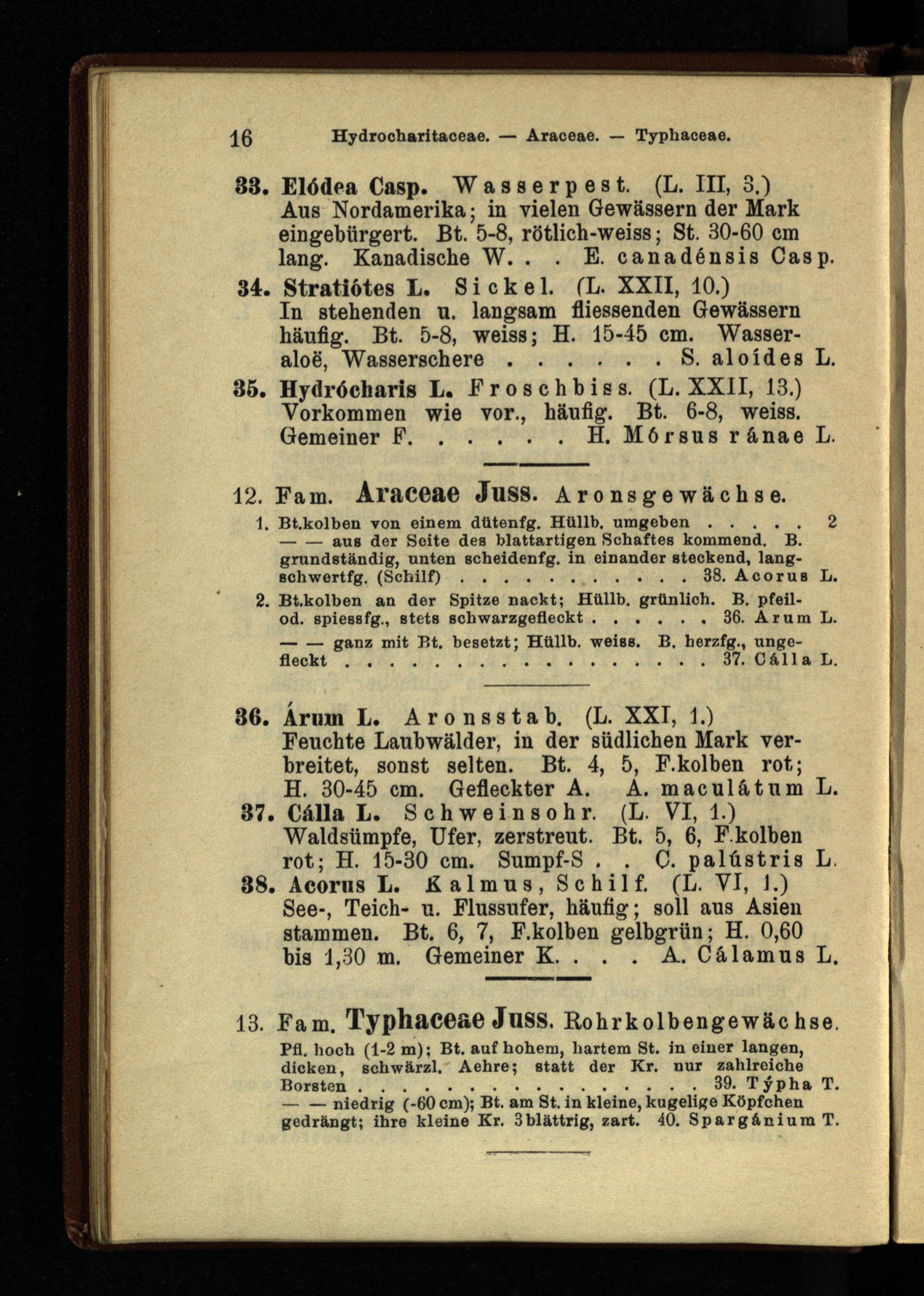 37. Cälla L. Schweinsohr. (L. VI, 1.) Waldsümpfe, Ufer, zerstreut. Bt. 5, 6, F.kolben rot; H. 15-30 cm. Sumpf-S . . C. palüstris L.