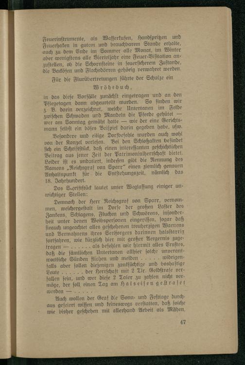 Demnach der Herr Reichsgraf von Sparr, vernommen, welchergeſtalt im Dorfe der großen Laſter des Zankens, Schlagens, Fluchen und Schwörens, inſonderheit unter denen Weibsperſonen eingeriſſen, ſogar daß ſieauch ungeachtet alles geſchehenen treuherzigen Warnens und Vermahnens ihres Seelſorgers darinnen halsſtarrig fortfahren, wie kürzlich hier mit großer Aergernis zugetragen als befehlen wir hiermit alles Ernſtes, daß die ſämtlichen Untertanen allhier ſolche unverantwortliche Sünden fliehen und menden widrigenfalls aber ſollen diejenigen zankſüchtige und boshaſtige Leute der Herrſchaft mit 2 Tlr. Geldſtrafe verfallen fein, und wer dieſe 2 Taler zu zahlen nicht vermöge, der ſoll einen Tag am Halse iſen geſtrafet werden—