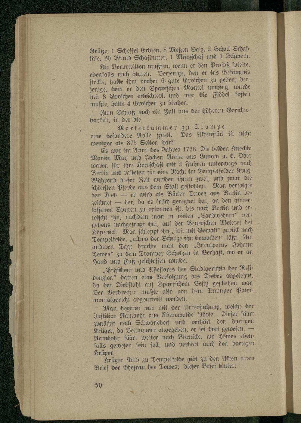 Es war im April des Jahres 1738. Die beiden Knechte Martin May und Jochen Nöthe aus Lunow a. d. Oder waren für ihre Herrſchaſt mit 2 Fuhren unterwegs nach Berlin und vaſteten für eine Nacht im Tempel felder Krug. Während dieſer Zeit wurden ihnen zwei, und zwar die ſchönſten Pferde aus dem Stall geſtohlen. Man verfolgt den Dieb— er wird als Bächer Tewes aus Berlin bezeichnet— der, da es friſch geregnet hat, an den hinterlaſſenen Spuren zu erbennen iſt, bis nach Berlin und erwiſcht ihn, nachdem man in vielen„Landwehren“ vergebens nachgefragt hat, auf der Beyerſchen Meierei bei Köpenick. Man ſchleppt ihn„faſt mit Gewalt“ zurück nach Tempelfelde,„allwo der Schulze ihn bewachen“ läßt. Am anderen Tage brachte man den„Inculpatus Johann Tewes“ zu dem Tramper Schulzen in Verhaft, wo er an Hand und Fuß geſchloſſen wunde.