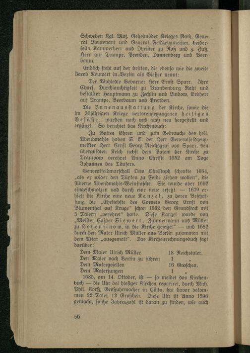 Generalfeldmarſchall Otto Chniſtoph ſchenkte 1664, „als er wider den Türken zu Felde ziehen wollen“, die ſilberne Abendmahls⸗Weinflaſche. Sie wurde aber 1692 eingeſchmolzen und durch eine neue erſetzt.— 1679 erhielt die Kirche eine neue Kanzel, zu deren Beſchaffung die„Eheliebſte des Cornets Georg Ernſt von Blumenthal auf Kruge“ ſchon 1662 den Grundſtock mit 3 Talern„verehret“ hatte. Dieſe Kanzel wurde von „Meiſter Caſper Siewert, Zimmermann und Müller zu Hohenfäinomw, in die Kirche geſetzet“— und 1682 durch den Maler Ulrich Müller aus Berlin zuſammen mit dem Altar„ausgemalt“. Das Kirchenrechnungsbuch ſagt darüber: