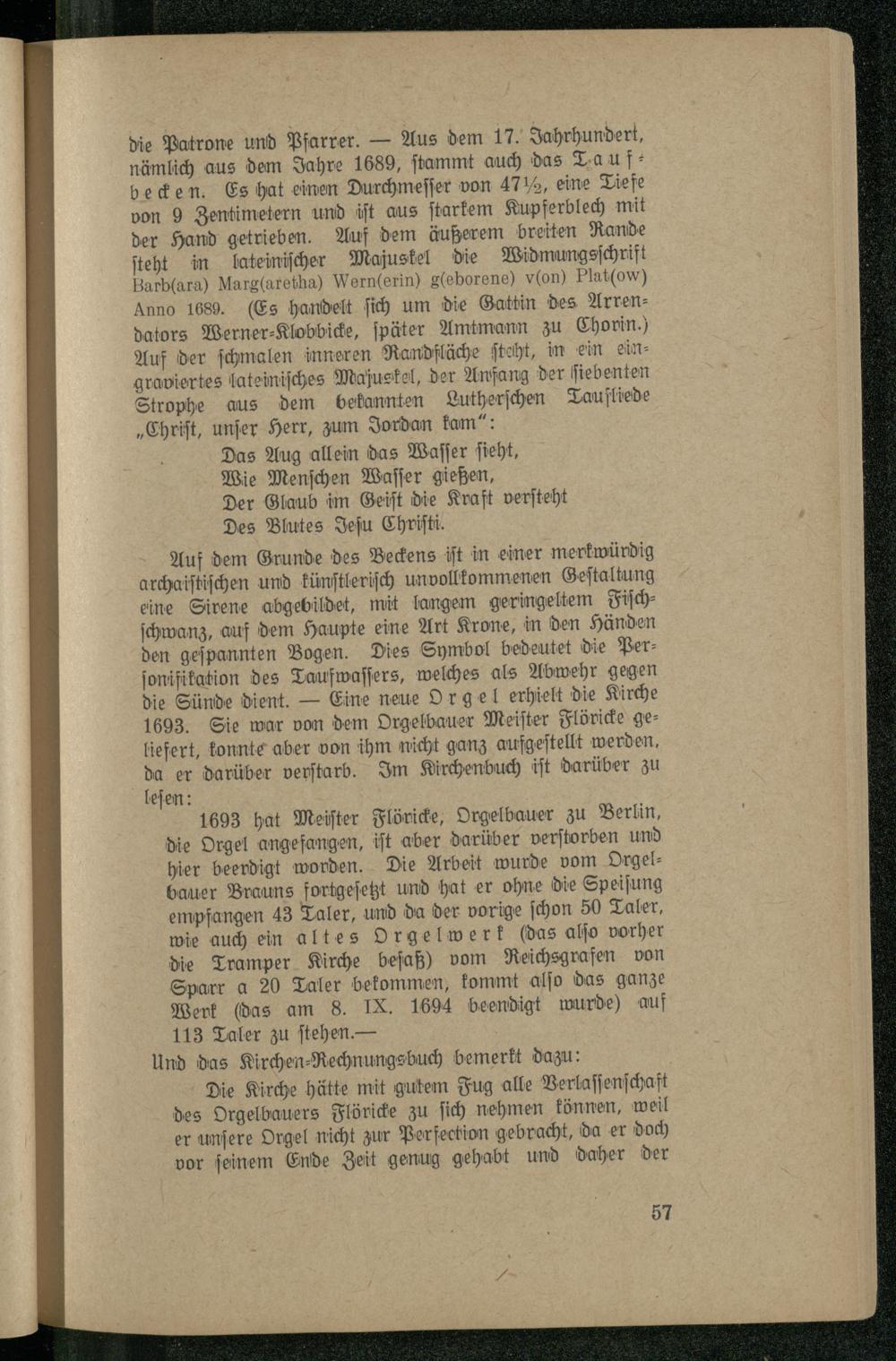 Auf dem Grunde des Beckens iſt in einer merkwürdig archaiſtiſchen und künſtleriſch unvollkommenen Geſtaltung eine Sirene abgebildet, mit langem geringeltem Fiſchſchwanz, auf dem Haupte eine Art Krone, in den Händen den geſpannten Bogen. Dies Symbol bedeutet die Perſonifikation des Taufwaſſers, welches als Abwehr gegen die Sünde dient.— Eine neue Orgel erhielt die Kirche 1693. Sie war von dem Orgelbauer Meiſter Flöricke geliefert, konnte aber von ihm nicht ganz aufgeſtellt werden, da er darüber verſtarb. Im Kirchenbuch iſt darüber zu leſen: