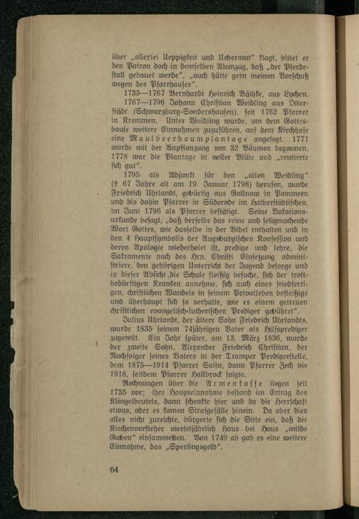 Julius Uhrlandt, der ältere Sohn Friedrich Uhrlandts, wurde 1835 ſeinem 74jährigen Vater als Hilfsprediger zugeteilt. Ein Jahr ſpäter, am 13. März 1836, wurde der zweite Sohn, Alexander Friedrich Chriſtian, der Nachfolger ſeines Vaters in der Tramper Predigerſtelle, dem 1875—1914 Pfarrer Salin, dann Pfarrer Zech bis 1918, ſeitdem Pfarrer Hallbrock folgte.