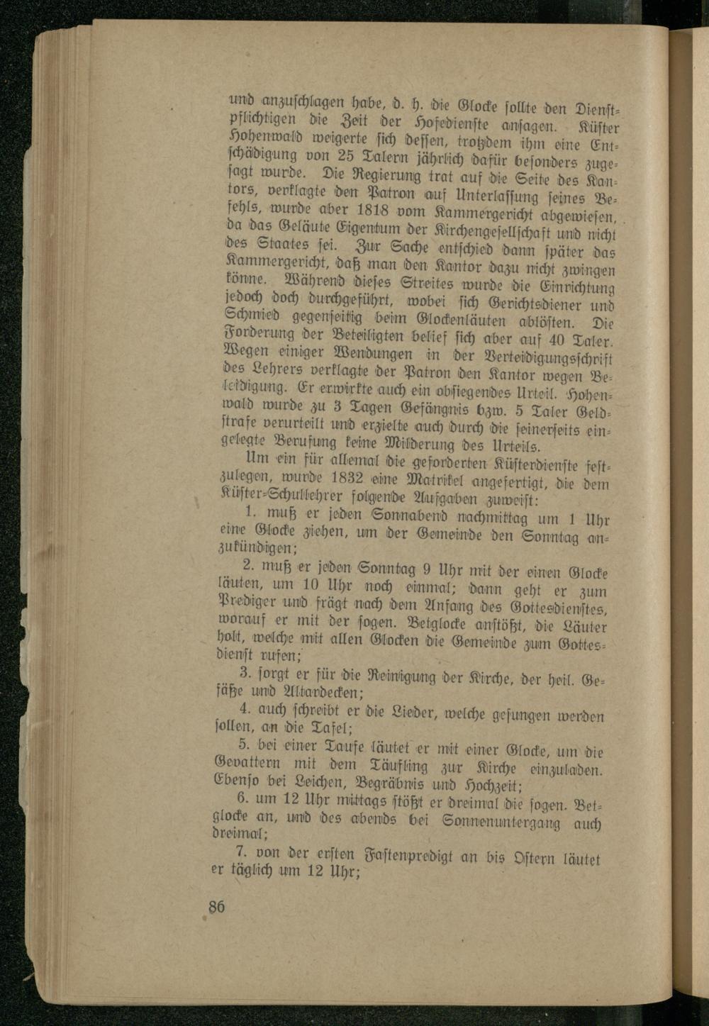 und anzuſchlagen habe, d. h. die Glocke ſollte den Dienſtpflichtigen die Zeit der Hofedienſte anſagen. Küſter Hohenwald weigerte ſich deſſen, trotzdem ihm eine Entſchädigung von 25 Talern jährlich dafür beſonders zugeſagt wurde. Die Regierung trat auf die Seite des Han: tors, verklagte den Patron auf Unterlaſſung feines Be: fehls, wurde aber 1818 vom Kammergericht abgewieſen, da das Geläute Eigentum der Kirchengeſellſchaft Und nicht des Staates ſei. Zur Sache entſchied dann ſpäter das Kammergericht, daß man den Kantor dazu nicht zwingen könne. Während dieſes Streites wurde die Einrichtung jedoch doch durchgeführt, wobei ſich Gerichtsdiener und Schmied gegenſeitig beim Glockenläuten ablöſten. Die Forderung der Beteiligten belief ſich aber auf 40 Taler. Wegen einiger Wendungen in der Verteidigungsſchrift des Lehrers verklagte der Patron den Kantor wegen Beleidigung. Er erwirkte auch ein obſiegendes Urteil. Hohenwald wurde zu 3 Tagen Gefängnis bzw. 5 Taler Geld— ſtrafe verurteilt und erzielte auch durch die ſeinerſeits eingelegte Berufung keine Milderung des Urteils.
