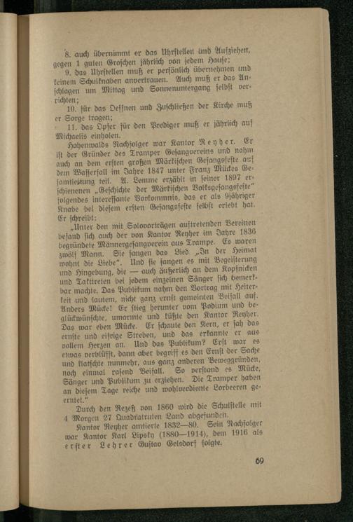 Kantor Reyher amtierte 1832— 80. Sein Nachfolger war Kantor Karl Lipsky(1880-14914), dem 1916 als erſter Lehrer Sultan Gelsdorf folgte.