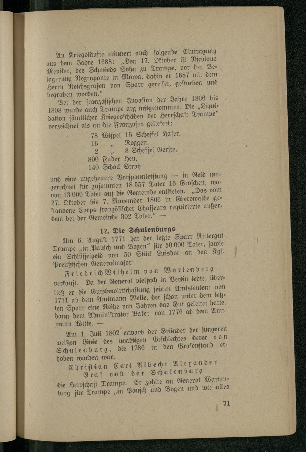 Bei der franzöſiſchen Invaſion der Jahre 1806 bis 1808 wurde auch Trampe arg mitgenommen. Die„Liquidation ſämtlicher Kriegesſchäden der Herrſchaft Trampe“ verzeichnet als an die Franzoſen geliefert: