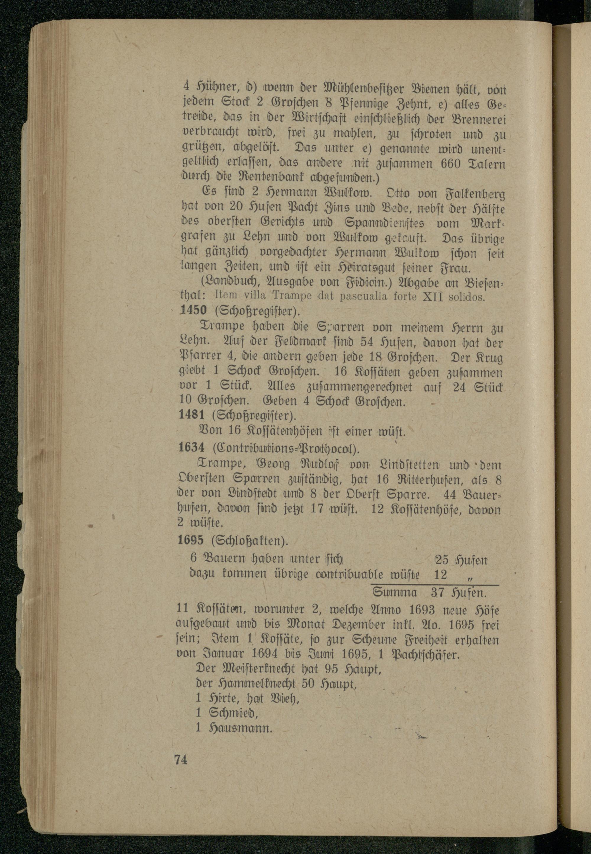 Trampe haben die Sparven von meinem Herrn zu Lehn. Auf der Feldmark ſind 54 Hufen, davon hat der Pfarrer 4, die andern geben jede 18 Groſchen. Der Krug giebt 1 Schock Groſchen. 16 Koſſäten geben zuſammen vor 1 Stück. Alles zuſammengerechnet auf 24 Stück 10 Groſchen. Geben 4 Schock Groſchen.