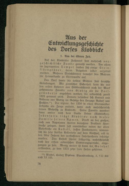 Das Dorf ſowie die beiden Mühlen ſind deutſche Gründungen. Mit ziemlicher Sicherheit kann die mit den erſten Kolonen aus Süddeutſchland nach der Mark gekommene Familie von Glob ig als die Dorfgründerin angeſehen werden, die urkundlich zuerſt 1323 genannt wird. Damals befanden ſich Konrad und Andreas von Globig im Gefolge des Herzogs Rudolf von Sachſen.) Der letztere, der 1350 in einer Eberswalder Urkunde als Zeuge auftritt, hatte auch wahrſcheinlich ſeinen Wohnſitz zu Klobbicke. Seine Familie wandert dann weiter nach dem Lande Lebus lobbickſee). Jedenfalls trägt Klobbicke nach dieſer Familie feinen Namen. Direkt an der großen, noch von Napoleons Heeren benutzten Berliner Heerſtraße gelegen, ſtand faſt unmittelbar neben der alten Wehrkirche ein Ka ſt ell, deſſen Fundamente, namentlich die ſehr ſtarken Kellerteile auf dem Kirchhof, erſt in den 90er Jahren des verfloſſenen Jahrhunderts beſeitigt wurden. Das Kaſtell ſcheint frühzeitig, wahrſcheinlich nach der erſten askaniſchen Eroberungsperiode, eingegangen zu ſein. Wenig weiter iſt dann der Gu tshoßf entſtanden, zu dem 1375 zehn freie Hufen gehörten.