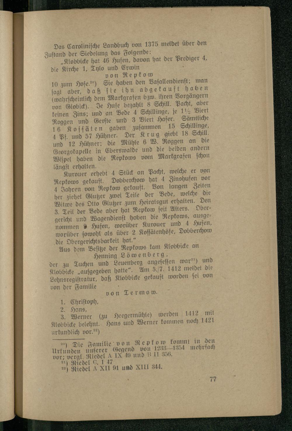 Aus dem Beſitze der Repkows kam Klobbicke an Henning Löwenberg, der zu Tuchen und Teuenberg angeſeſſen war“) und Klobbicke„aufgegeben hatte“. Am 5.7. 1412 meldet die Lehnsregiſtratur, daß Klobbicke gekauft worden ſei von von der Familie