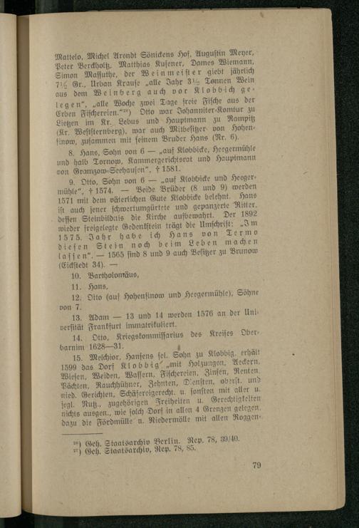 Mattelo, Michel Arendt Sönickens Hof, Auguſtin Meyer, Peter Berckholtz, Matthias Kuſener, Dames Wiemann, Simon Maſſuthe, der Weinmeiſter giebt jährlich 71% Gr., Urban Krauſe„alle Jahr 3½ Tonnen Wein aus dem Weinberg auch vor Klobbäch gelegen“,„alle Woche zwei Tage freie Fiſche aus der Erben Fiſchereien.““, Otto war Johanniter⸗Komtur zu Lietzen im Kr. Lebus und Hauptmann zu Rampitz (Kr. Weſtſternberg), war auch Mitbeſitzer von Hohenfinow, zuſammen mit ſeinem Bruder Hans(Nr. 6).