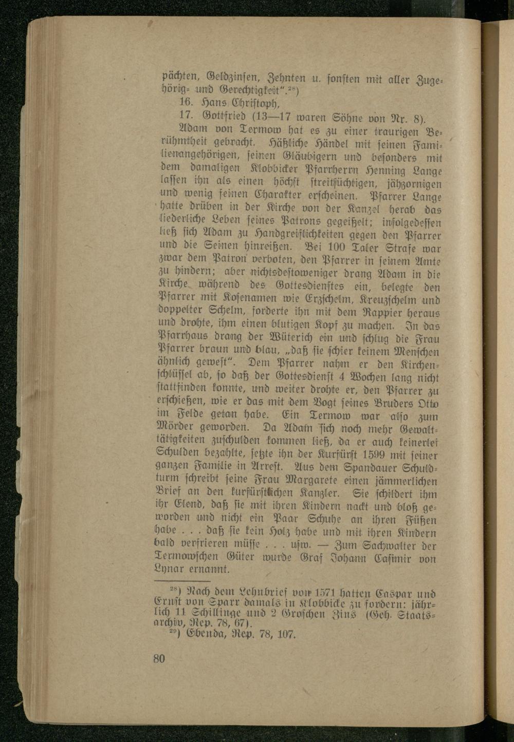 Adam von Termow hat es zu einer traurigen Berühmtheit gebracht. Häßliche Händel mit feinen Familienangehörigen, ſeinen Gläubigern und beſonders mit dem damaligen Klobbicker Pfarrherrn Henning Lange laſſen ihn als einen höchſt ſtreitſüchtigen, jähzornigen und wenig feinen Charakter erſcheinen. Pfarrer Lange hatte drüben in der Kirche von der Kanzel herab das liederliche Leben ſeines Patrons gegeißelt; infolgedeſſen ließ ſich Adam zu Handgreiflichkeiten gegen den Pfarrer und die Seinen hinreißen. Bei 100 Taler Strafe war zwar dem Patron verboten, den Pfarrer in ſeinem Amte zu hindern; aber nichtsdeſtoweniger drang Adam in die Kirche während des Gottesdienſtes ein, belegte den Pfarrer mit Koſenamen wie Erzſchelm, Kreuzſchelm und doppelter Schelm, forderte ihn mit dem Rappier heraus und drohte, ihm einen blutigen Kopf zu machen. In das Pfarrhaus drang der Wüterich ein und ſchlug die Frau Pfarrer braun und blau,„daß ſie ſchier keinem Menſchen ähnlich geweſt“ Dem Pfarrer nahm er den Kirchenſchlüſſel ab, ſo daß der Gottesdienſt 4 Wochen lang nicht ſtattfinden konnte, und weiter drohte er, den Pfarrer zu erſchießen, wie er das mit dem Vogt ſeines Bruders Otto im Felde getan habe. Ein Termow war alſo zum Mörder geworden. Da Adam ſich noch mehr Gewalttätigkeiten zuſchulden kommen ließ, da er auch keinerlei Schulden bezahlte, ſetzte ihn der Kurfürſt 1599 mit ſeiner ganzen Familie in Arreſt. Aus dem Spandauer Schuldturm ſchreibt ſeine Frau Margarete einen jämmerlichen Brief an den kurfürſtlichen Kanzler. Sie ſchildert ihm ihr Elend, daß ſie mit ihren Kindern nackt und bloß geworden und nicht ein Paar Schuhe an ihren Füßen habe.. daß fie kein Holz habe und mit ihren Kindern bald verfrieren müſſe. uſw.— Zum Sachwalter der Termowſchen Güter wurde Graf Johann Caſimir von Lynar ernannt.