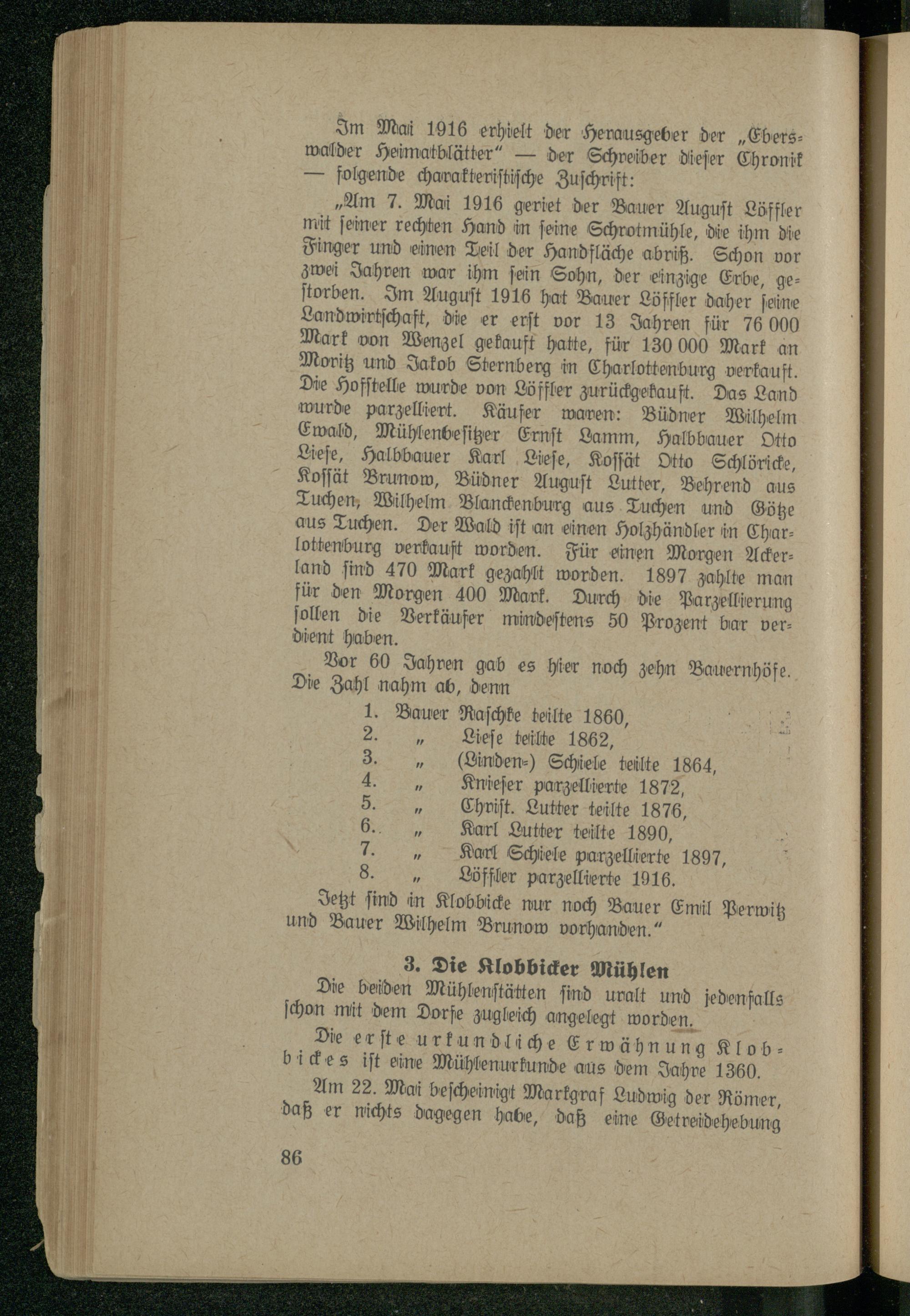 „Am 7. Mai 1916 geriet der Bauer Auguſt Löffler mit ſeiner rechten Hand in ſeine Schrotmühle, die ihm die Finger und einen Teil der Handfläche abriß. Schon vor zwei Jahren war ihm ſein Sohn, der einzige Erbe, geſtorben. Im Auguſt 1916 hat Bauer Löffler daher feine Landwirtſchaft, die er erſt vor 13 Jahren für 76 000 Mark von Wenzel gekauft hatte, für 130 000 Mark an Moritz und Jakob Sternberg in Charlottenburg verkauft. Die Hofſtelle wurde von Löffler zurückgehauft. Das Land wurde parzelliert. Käufer waren: Büdner Wilhelm Ewald, Mühlenbeſitzer Ernſt Lamm, Halbbauer Otto Lieſe, Halbbauer Karl Lieſe, Koſſät Otto Schlöricke, Koſſät Brunow, Büdner Auguſt Lutter, Behrend aus Tuchen, Wilhelm Blanchenburg aus Tuchen und Götze aus Tuchen. Der Wald iſt an einen Holzhändler in Charlottenburg verkauft worden. Für einen Morgen Acker— land ſind 470 Mark gezahlt worden. 1897 zahlte man für den Morgen 400 Mark. Durch die Parzellierung ſollen die Verkäufer mindeſtens 50 Prozent bar ver: dient haben.