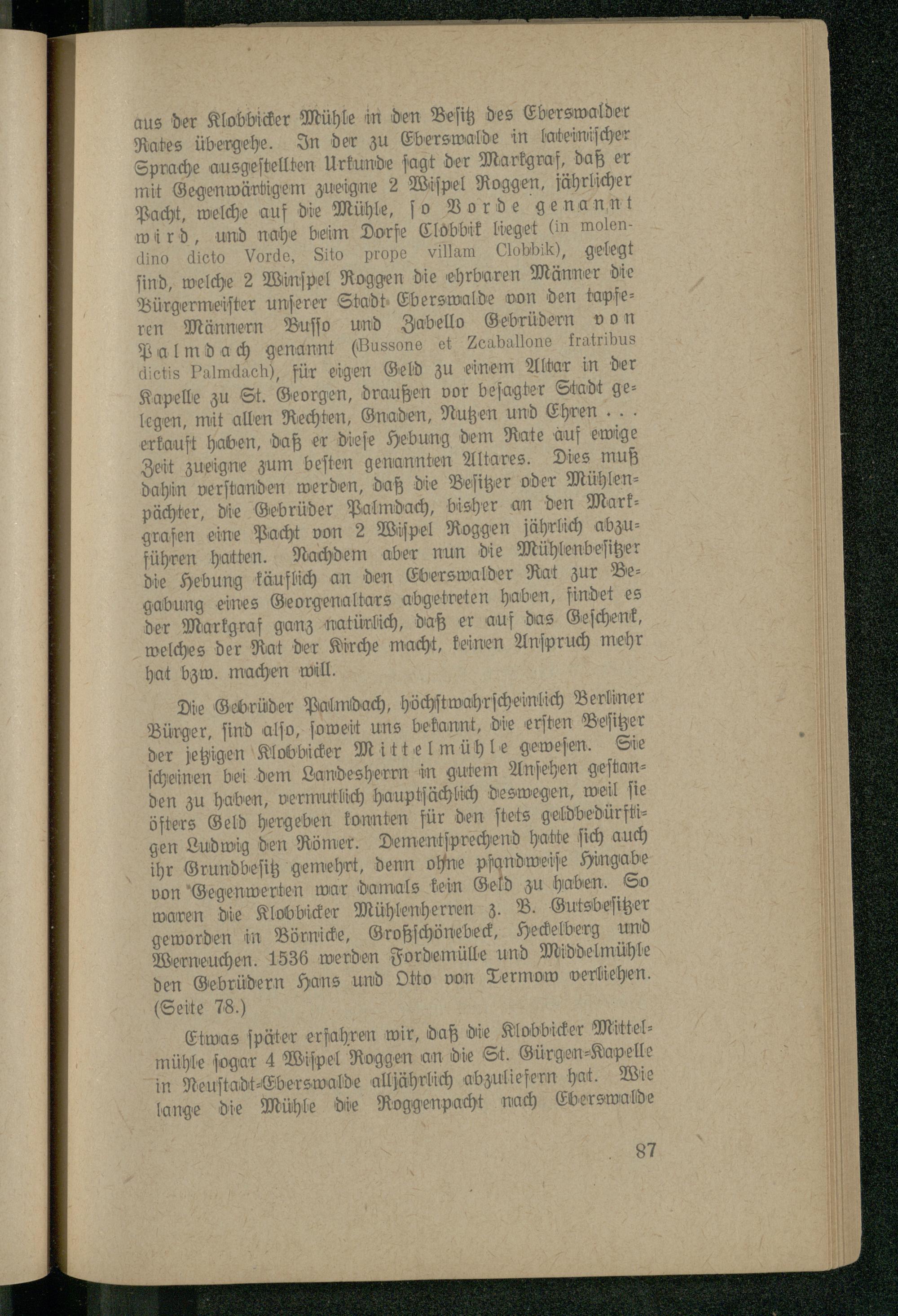 aus der Klobbicker Mühle in den Beſitz des Eberswalder Rates übergehe. In der zu Eberswalde in lateiniſcher Sprache ausgeſtellten Urkunde ſagt der Markgraf, daß er mit Gegenwärtigem zueigne 2 Wiſpel Roggen, jährlicher Pacht, welche auf die Mühle, ſo Vorde genannt würd, und nahe beim Dorfe Clobbik lieget(in molendino dicto Vorde, Sito prope villam Clobbik), gelegt ſind, welche 2 Winſpel Roggen die ehrbaren Männer die Bürgermeiſter unſerer Stadt Eberswalde von den tapferen Männern Buſſo und Zabello Gebrüdern von Palmda ch genannt(Bussone et Zeaballone fratribus dietis Palmdach), für eigen Geld zu einem Altar in der Kapelle zu St. Georgen, draußen vor beſagter Stadt gelegen, mit allen Rechten, Gnaden, Nutzen und Ehren. erkauft haben, daß er dieſe Hebung dem Rate auf ewige Zeit zueigne zum beſten genannten Altares. Dies muß dahin verſtanden werden, daß die Beſitzer oder Mühlenpächter, die Gebrüder Palmdach, bisher an den Markgrafen eine Pacht von 2 Wiſpel Roggen jährlich abzuführen hatten. Nachdem aber nun die Mühlenbeſitzer die Hebung käuflich an den Eberswalder Rat zur Begabung eines Georgenaltars abgetreten haben, findet es der Markgraf ganz natürlich, daß er auf das Geſchenk, welches der Rat der Kirche macht, keinen Anſpruch mehr hat bzw. machen will.