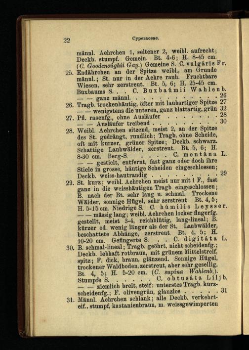 28. Weibl. Aehrchen sitzend, meist 2, an der Spitze des St. gedrängt, rundlich; Tragb. ohne Scheide, oft mit kurzer, grüner Spitze; Deckb. schwarz. Schattige Laubwälder, zerstreut. Bt. 5, 6; H. 8-30 cm. Berg-S . . . . C. montänaL.