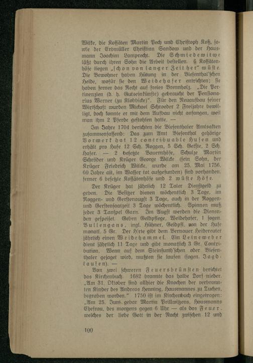Im Jahre 1704 berichten die Bieſenthaler Amtsakten zuſammenfaſſend: Das zum Amt Bieſenthal gehörige Vorwerk hat 12 conträbunable Hufen und erhält pro Hufe 12 Sch. Roggen, 5 Sch. Gerſte, 2 Sch. Hafer.— 2 beſetzte Bauernhöfe, Schulze Martin Schröder und Krüger George Wilcke(ſein Sohn, der Krüger Friedrich Wilcke, wurde am 25. Mai 1756, 60 Jahre alt, im Waſſer tot aufgefunden) find vorhanden, ferner 6 beſetzte Koſſätenhöfe und 2 wüſte Höfe.