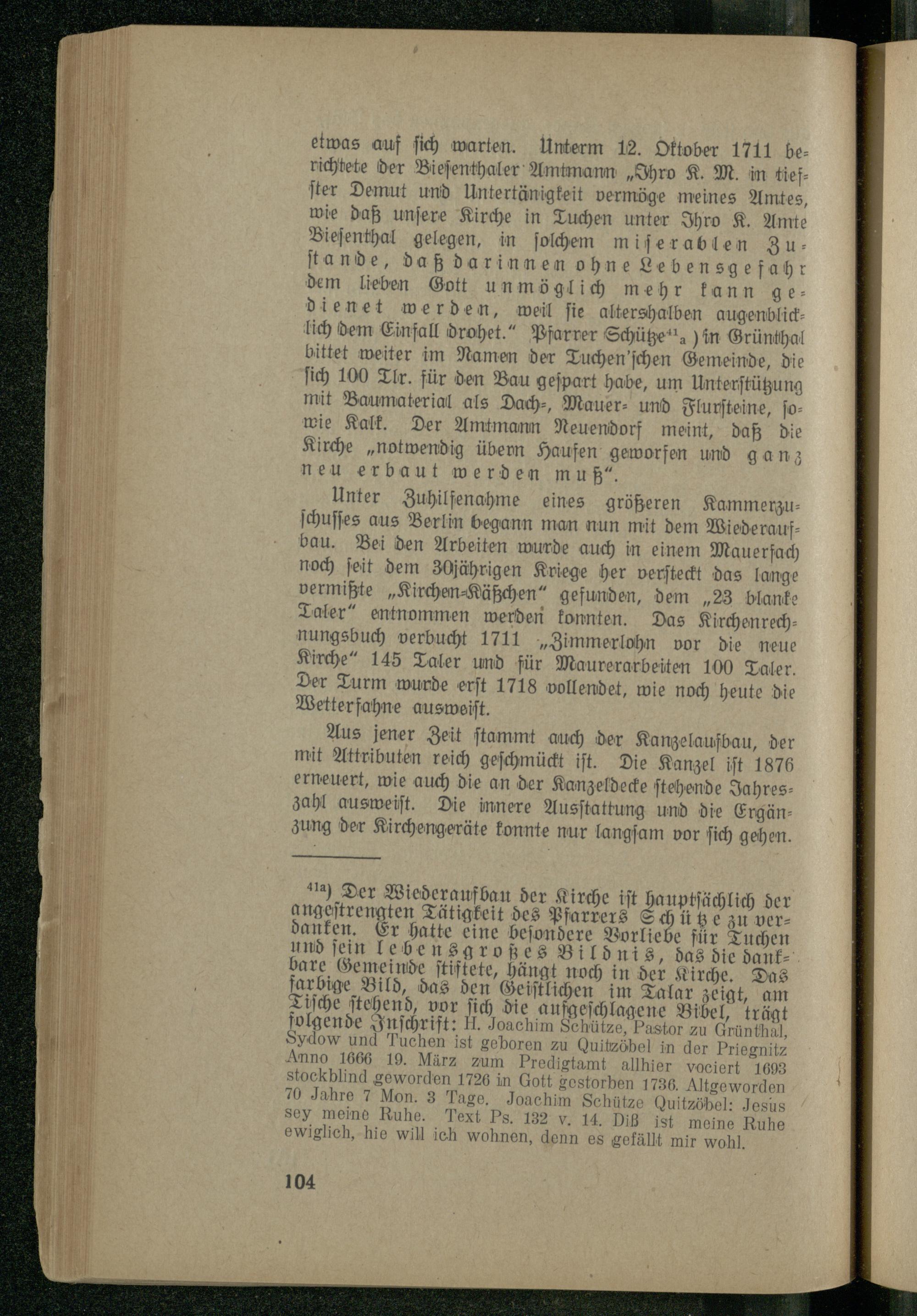 a) Der Wiederaufbau der Kirche iſt hauptſächlich der angeſtrengten Tätigkeit des Pfarrers Schütze zu verdanken. Er hatte eine beſondere Vorliebe für Tuchen und fein lebensgroßes Bildni s, das die dankbare Gemeinde ſtiftete, hängt noch in der Kirche. Das farbige Bild, das den Geiſtlichen im Talar zeigt, am Tiſche ſtehend, vor ſich die aufgeſchlagene Bibel, trägt folgende Inſchrift: H. Joachim Schütze, Pastor zu Grünthal, Sydow und Tuchen ist geboren zu Quitzöbel in der Priegnitz Anno 1666 19. März zum Predigtamt allhier vociert 1693 stockblind geworden 1726 in Gott gestorben 1736. Altge worden 70 Jahre 7 Mon. 3 Tage. Joachim Schütze Quitzöbel: Jesus Sey meine Ruhe. Text Ps. 132 v. 14. Diß ist meine Ruhe ewiglich,-hie will ich wohnen, denn es gefällt mir wohl.