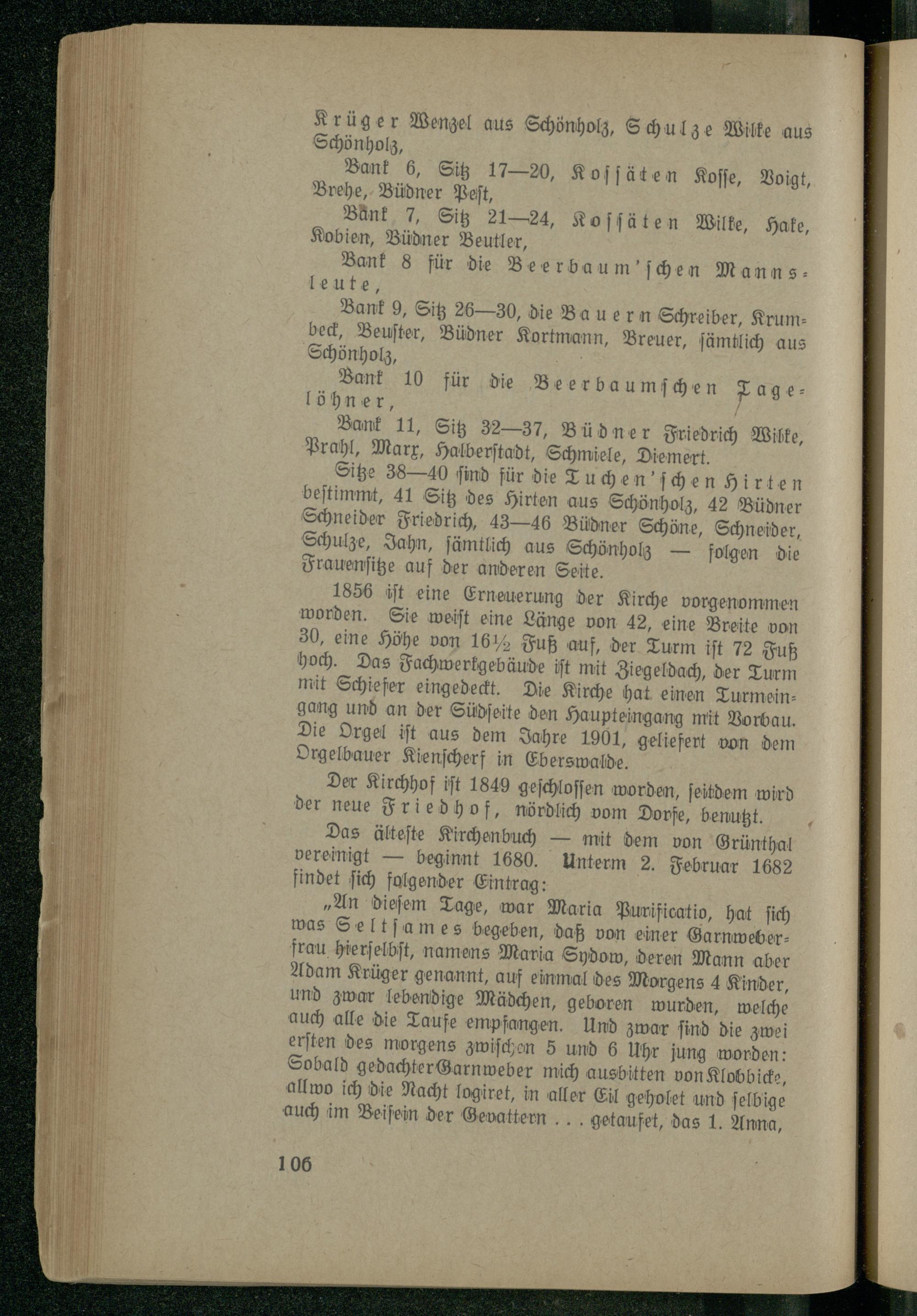1856 iſt eine Erneuerung der Kirche vorgenommen worden. Sie weiſt eine Länge von 42, eine Breite von 30, eine Höhe von 1614 Fuß auf, der Turm iſt 72 Fuß hoch. Das Fachwerkgebäude iſt mit Ziegeldach, der Turm mit Schiefer eingedeckt. Die Kirche hat einen Turmein— gang und an der Südſeite den Haupteingang mit Vorbau. Die Orgel iſt aus dem Jahre 1901, geliefert von dem Orgelbauer Kienſcherf in Eberswalde.