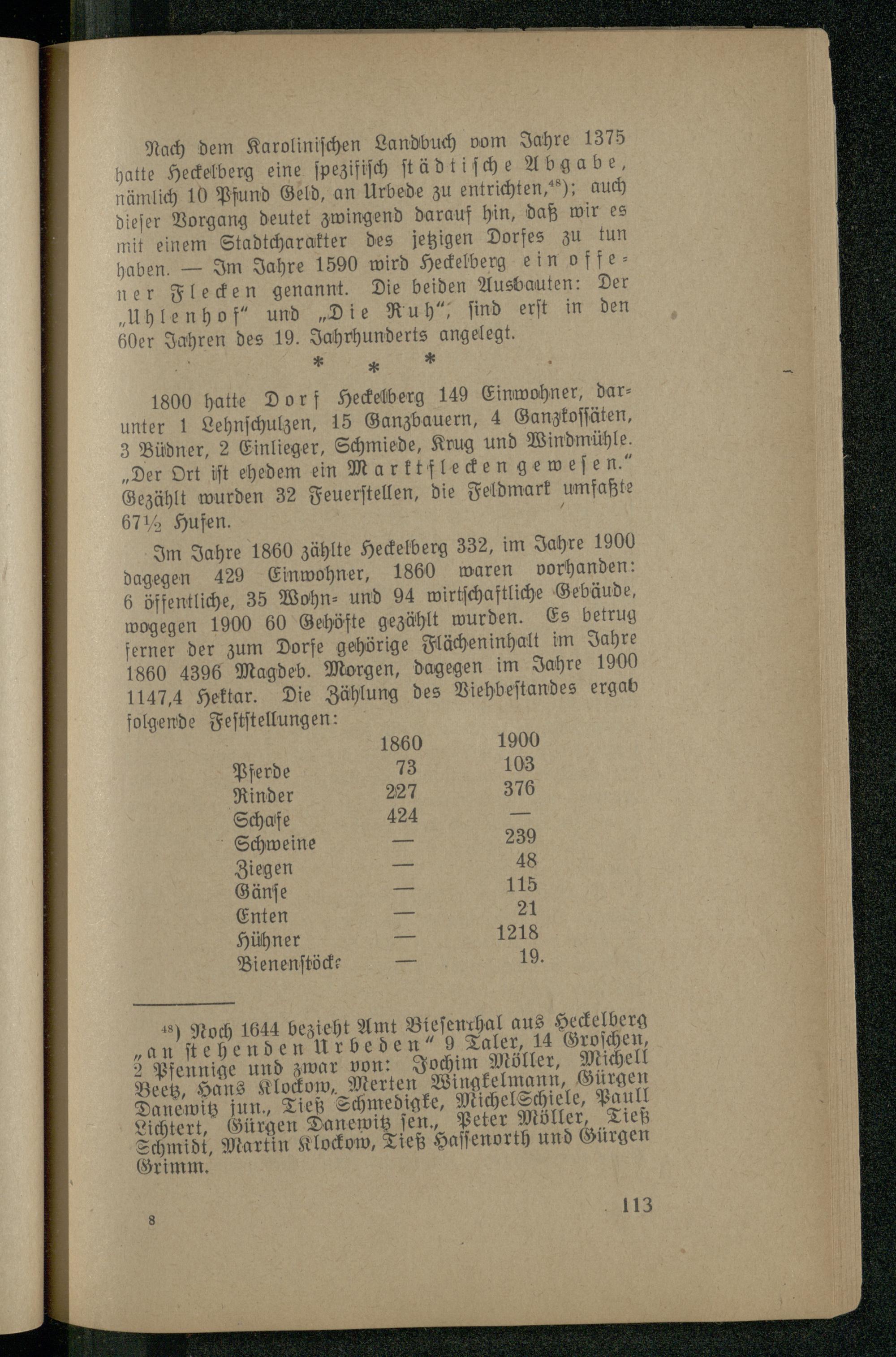 Im Jahre 1860 zählte Heckelberg 332, im Jahre 1900 dagegen 429 Einwohner, 1860 waren vorhanden: 6 öffentliche, 35 Wohn⸗ und 94 wirtſchaftliche Gebäude, wogegen 1900 60 Gehöfte gezählt wurden. Es betrug ferner der zum Dorfe gehörige Flächeninhalt im Jahre 1860 4396 Magdeb. Morgen, dagegen im Jahre 1900 147,4 Hektar. Die Zählung des Viehbeſtandes ergab folgende Feſtſtellungen: