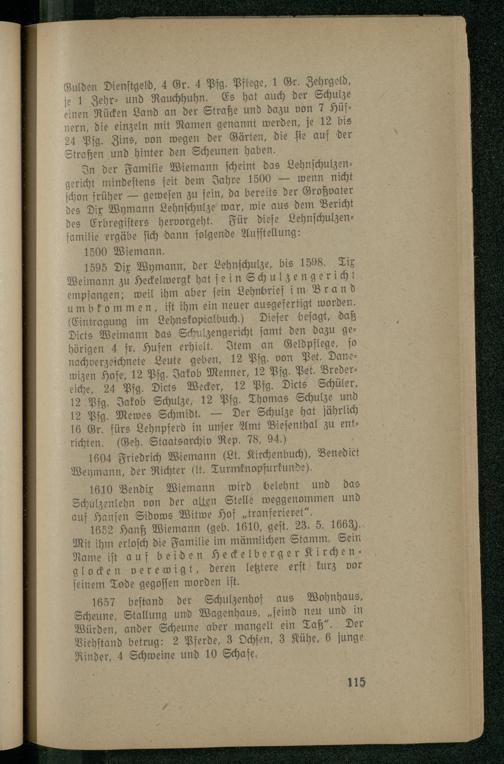 1595 Dix Wymann, der Lehnſchulze, bis 1598. Tix Weimann zu Heckelwergk hat ſe in Schulzengericht empfangen; weil ihm aber ſein Lehnbrief im Brand umbkom men, iſt ihm ein neuer ausgefertigt worden. (Eintragung im Lehnskopialbuch. Dieſer beſagt, daß Dicts Weimann das Schulzengericht ſamt den dazu gehörigen 4 fr. Hufen erhielt. Item an Geldpflege, ſo nachverzeichnete Leute geben, 12 Pfg. von Pet. Danewizen Hofe, 12 Pfg. Jakob Menner, 12 Pfg. Pet. Breder