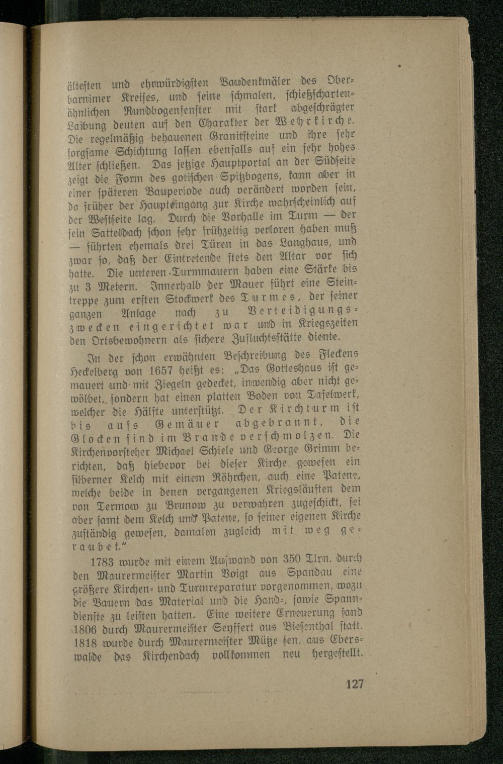 In der ſchon erwähnten Beſchreibung des Fleckens Heckelberg von 1657 heißt es:„Das Gotteshaus iſt gemauert und mit Ziegeln gedecket, inwendig aber nicht gewölbet, ſondern hat einen platten Boden von Tafelwerk, welcher die Hälfte unterſtützt. Der Kirchturm i ſt bis aufs Gemäuer abgebrannt, die Glocken ſind im Brande verſchmolzen. Die Kirchen vorſteher Michael Schiele und George Grimm berichten, daß hiebevor bei dieſer Kirche geweſen ein ſilberner Kelch mit einem Röhrchen, auch eine Patene, welche beide in denen vergangenen Kriegsläuften dem von Termow zu Brunow zu verwahren zugeſchickt, ſei aber ſamt dem Kelch und Patene, ſo ſeiner eigenen Kirche zuſtändig geweſen, damalen zugleich mit weg ge: raubet.“