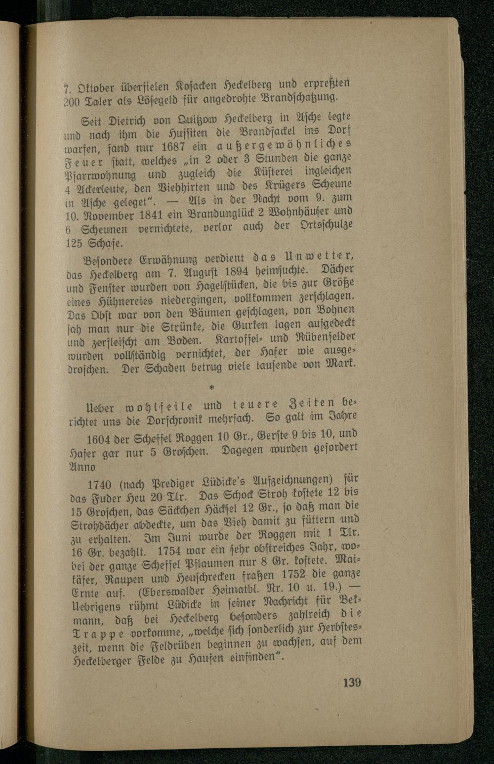 Seit Dietrich von Quitzow Heckelberg in Aſche legte und nach ihm die Huſſiten die Brandfackel ins Dorf warfen, fand nur 1687 ein außergewöhnliches Feuer ſtatt, welches„in 2 oder 3 Stunden die ganze Ffarrwohnung und zugleich die Küſterei ingleichen Ackerleute, den Viehhirten und des Krügers Scheune in Aſche geleget“.— Als in der Nacht vom 9. zum 10. November 1841 ein Brandunglück 2 Wohnhäuſer und 5 Scheunen vernichtete, verlor auch der Ortsſchulze 125 Schafe.