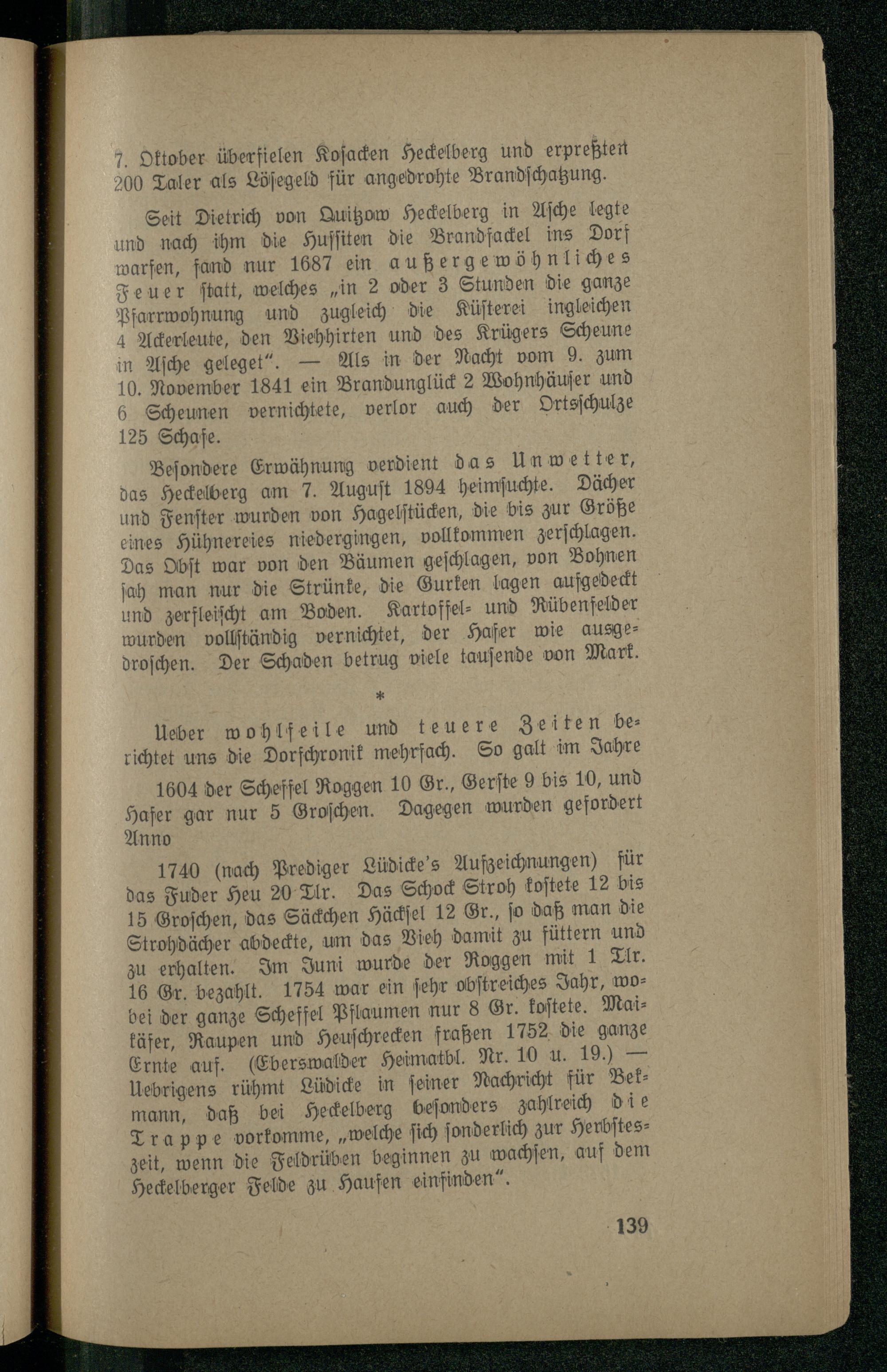Beſondere Erwähnung verdient das Unwetter, das Heckelberg am 7. Auguſt 1894 heimſuchte. Dächer und Fenſter wurden von Hagelſtücken, die bis zur Größe eines Hühnereies niedergingen, vollkommen zerſchlagen. Das Obſt war von den Bäumen geſchlagen, von Bohnen ſah man nur die Strünke, die Gurken lagen aufgedeckt und zerfleiſcht am Boden. Kartoffel und Rübenfelder wurden vollſtändig vernichtet, der Hafer wie ausgedroſchen. Der Schaden betrug viele tauſende von Mark.