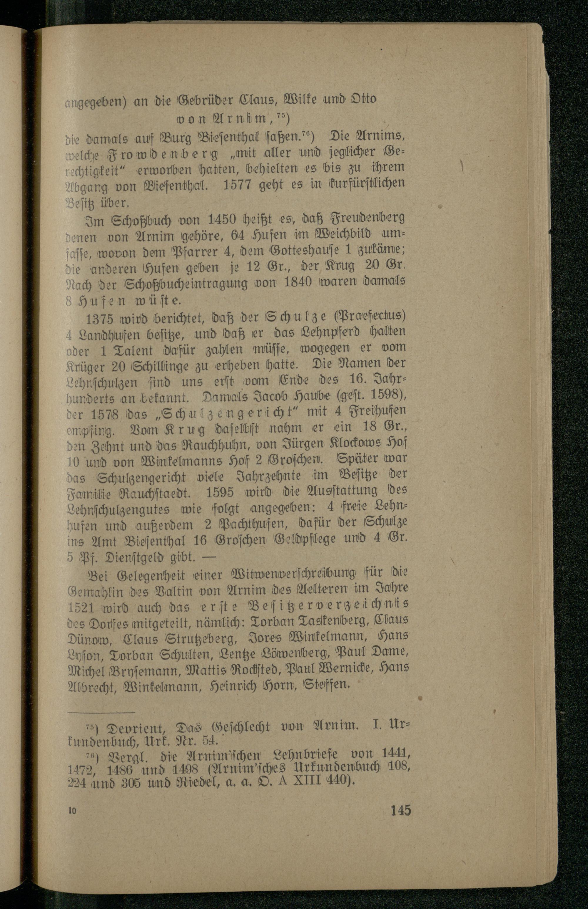 76) Vergl. die Arnim'ſchen Lehnbriefe von 1441, 1472, 1486 und 1498(Arnim'ſches Urkundenbuch 108, 224 und 305 und Riedel, a. a. O. A XIII 440].