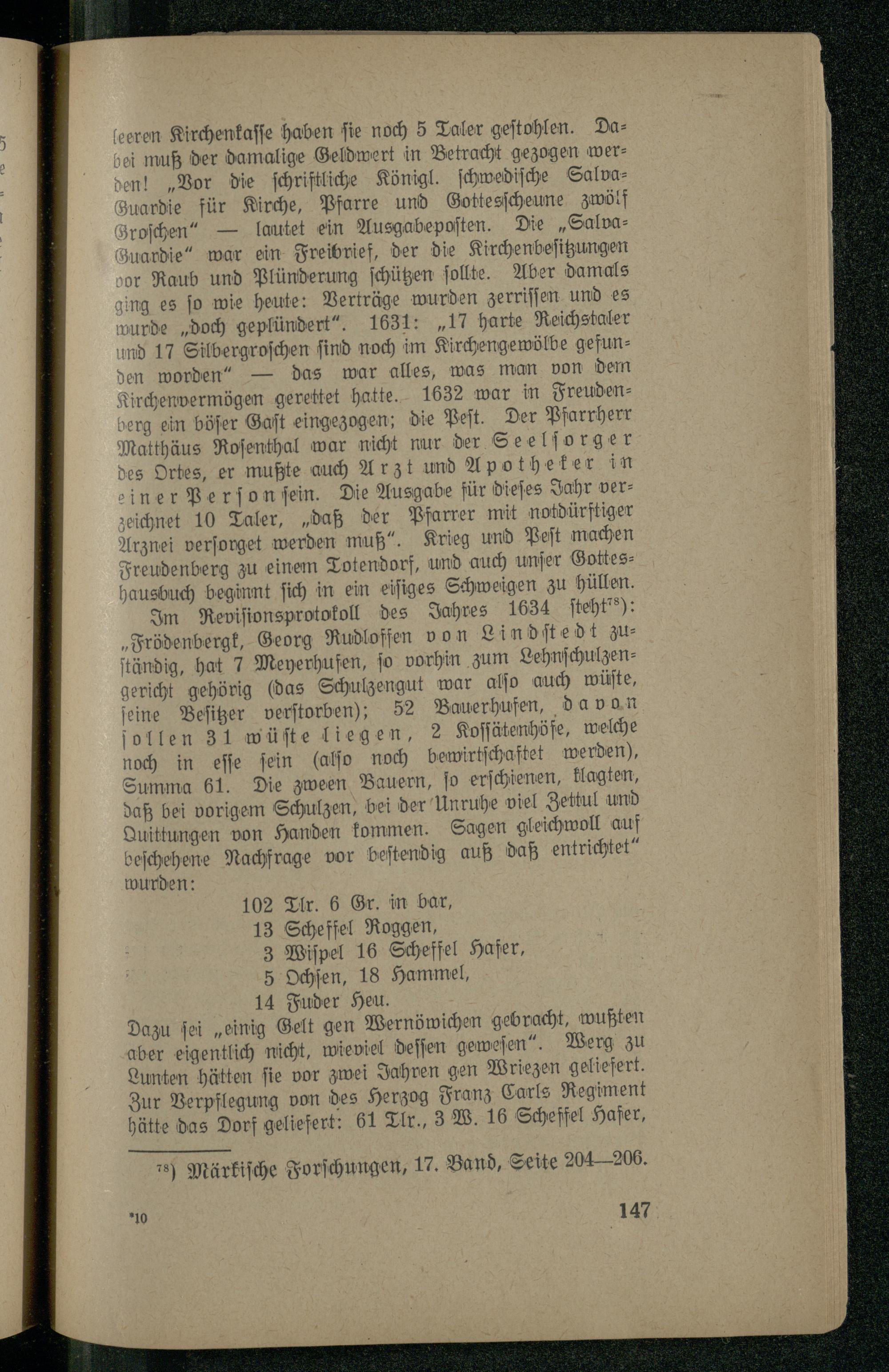 eren Kirchenkaſſe haben fie noch 5 Taler geſtohlen. Daei muß der damalige Geldwert in Betracht gezogen werden!„Vor die ſchriftliche Königl. ſchwediſche Salvazuardie für Kirche, Pfarre und Gottesſcheune zwölf zroſchen— lautet ein Ausgabepoſten. Die„Salvazuardie“ war ein Freibrief, der die Kirchenbeſitzungen or Raub und Plünderung ſchützen ſollte. Aber damals ing es fo wie heute: Verträge wurden zerriſſen und es vurde„doch geplündert“ 1631:„17 harte Reichstaler nd 17 Silbergroſchen ſind noch im Kirchengewölbe gefunzen worden“— das war alles, was man von dem dirchenvermögen gerettet hatte. 1632 war in Freudenerg ein böſer Gaſt eingezogen; die Peſt. Der Pfarrherr Matthäus Roſenthal war nicht nur der Seelſorger zes Ortes, er mußte auch Arzt und Apotheker in iner Perſon ſein. Die Ausgabe für dieſes Jahr verzeichnet 10 Taler,„daß der Pfarrer mit notdürftiger Arznei verſorget werden muß“. Krieg und Peſt machen Freudenberg zu einem Totendorf, und auch unſer Gotteshausbuch beginnt ſich in ein eiſiges Schweigen zu hüllen. Im Reviſionsprotokoll des Jahres 1634 ſteht“*): „Frödenbergk, Georg Rudloffen von Lindſtedt zuſtändig, hat 7 Meyerhufen, ſo vorhin zum Lehnſchulzengericht gehörig(das Schulzengut war alſo auch wüſte, ſeine Beſitzer verſtorben); 52 Bauerhufen, davon ſollen 31 wüſte liegen, 2 Koſſätenhöfe, welche noch in eſſe ſein(alſo noch bewirtſchaftet werden), Summa 61. Die zween Bauern, ſo erſchienen, klagten, daß bei vorigem Schulzen, bei der Unruhe viel Zettul und Quittungen von Handen kommen. Sagen gleichwoll auf beſchehene Nachfrage vor beſtendig auß daß entrichtet“ wurden: 102 Tlr. 6 Gr. in bar, 13 Scheffel Roggen, 3 Wiſpel 16 Scheffel Hafer, 5 Ochſen, 18 Hammel, 14 Fuder Heu. Dazu ſei„einig Gelt gen Wernöwichen gebracht, wußten aber eigentlich nicht, wieviel deſſen geweſen“. Werg zu Lunten hätten ſie vor zwei Jahren gen Wriezen geliefert. Zur Verpflegung von des Herzog Franz Carls Regiment hätte das Dorf geliefert: 51 Tlr., 3 W. 16 Scheffel Hafer,