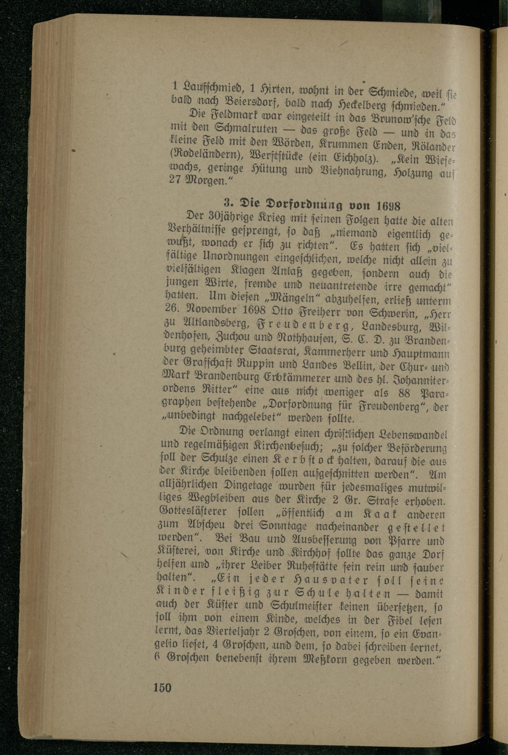 Der 30 jährige Krieg mit ſeinen Folgen hatte die alte Verhältniſſe geſprengt, ſo daß„niemand eigentlich ge wußt, wonach er ſich zu richten! Es hatten ſich„viel fältige Unordnungen eingeſchlichen, welche nicht allein z vielfältigen Klagen Anlaß gegeben, ſondern auch di jungen Wirte, fremde und neuantretende irre gemacht“ hatten. Um dieſen„Mängeln“ abzuhelfen, erließ unterm 265. November 1698 Otto Freiherr von Schwerin,„Her: zu Altlandsberg, Freudenber g, Landesburg, Wil denho fen, Zuchou und Nothhauſen, S. C. D. zu Branden burg geheimbter Staatsrat, Kammerherr und Hauptmanm der Grafſchaft Ruppin und Landes Bellin, der Chur⸗ und Mark Brandenburg Erbkämmerer und des hl. Johanniter ordens Ritter“ eine aus nicht weniger als 88 Para graphen beſtehende„Dorfordnung für Freudenberg“, der „unbedingt nachgelebet“ werden ſollte.
